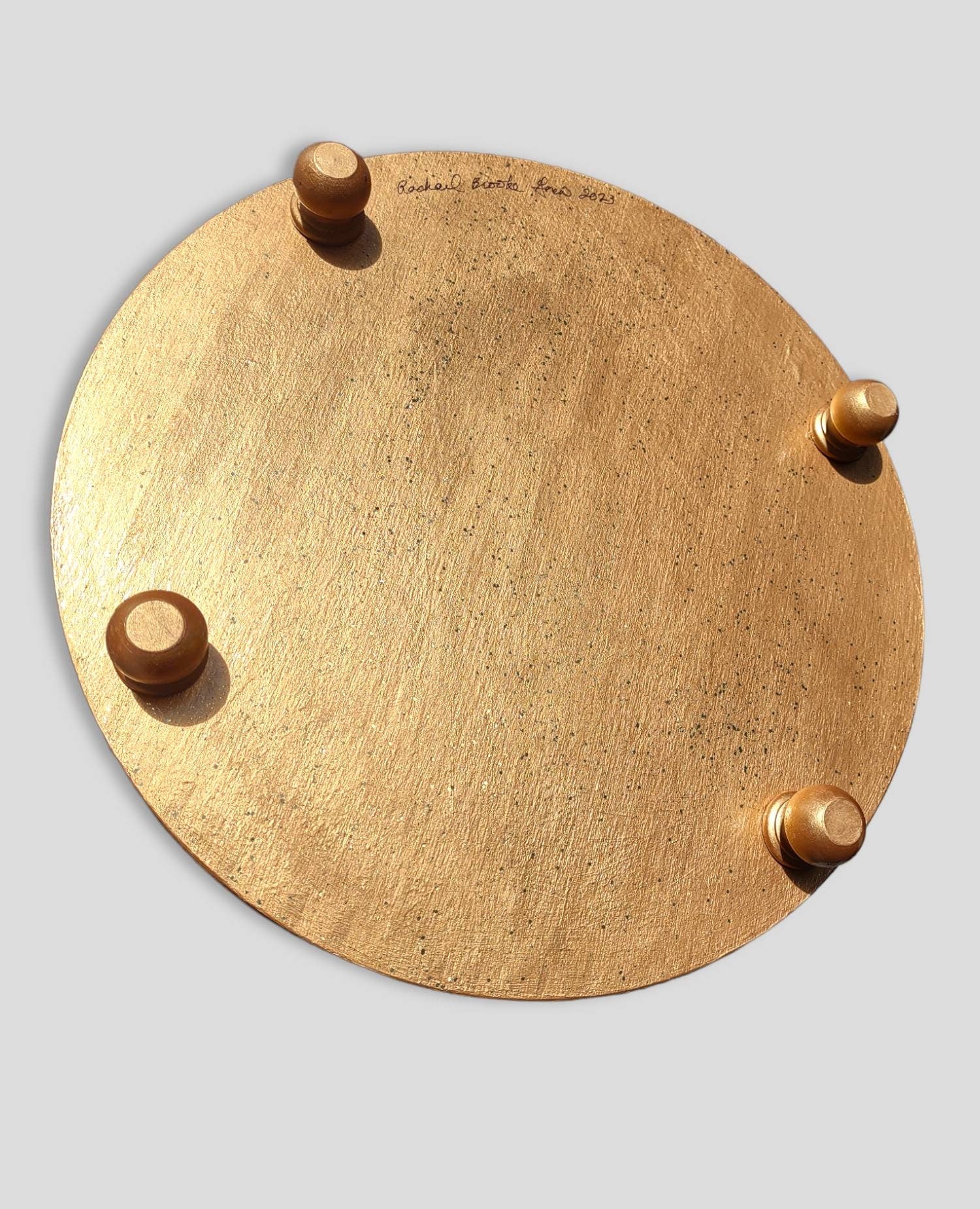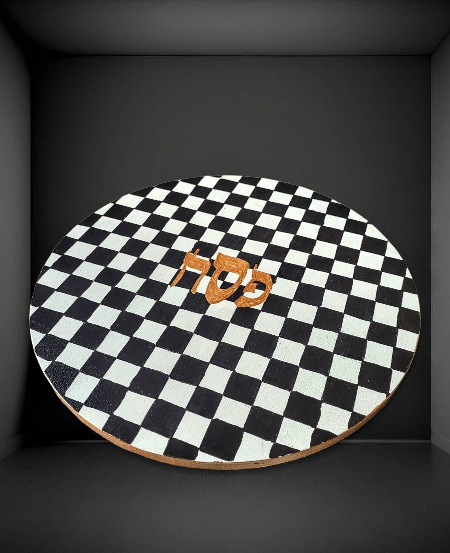 Hand-painted Black White and Gold Checkerboard with “Pesach” in Hebrew on a 12.5” diameter hardwood plate with wooden feet.