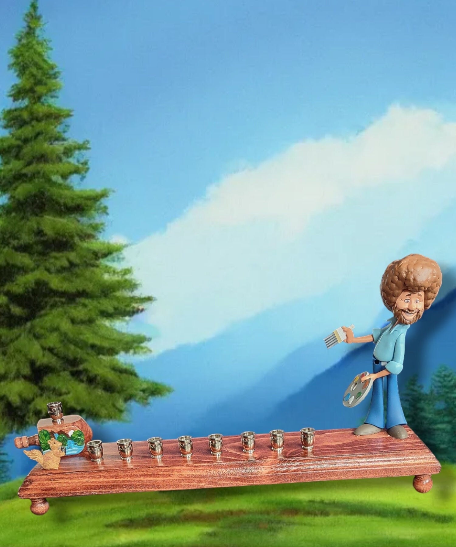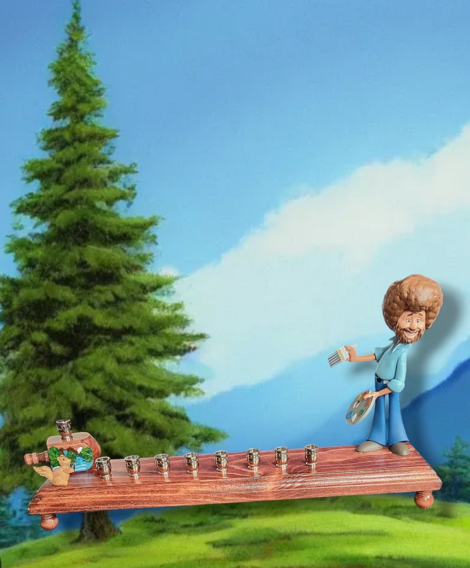 Hand-crafted from repurposed Bob Ross collectible figure, nickel candle cups, wood base, wooden squirrel and hand painted wood dreidel.