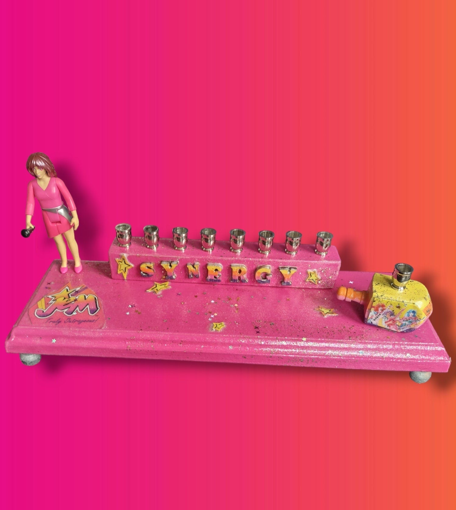 Hand-crafted from repurposed Jem collectible figure, nickel candle cups, wood base, decoupage wooden dreidel, hand painted "SYNERGY" letters.