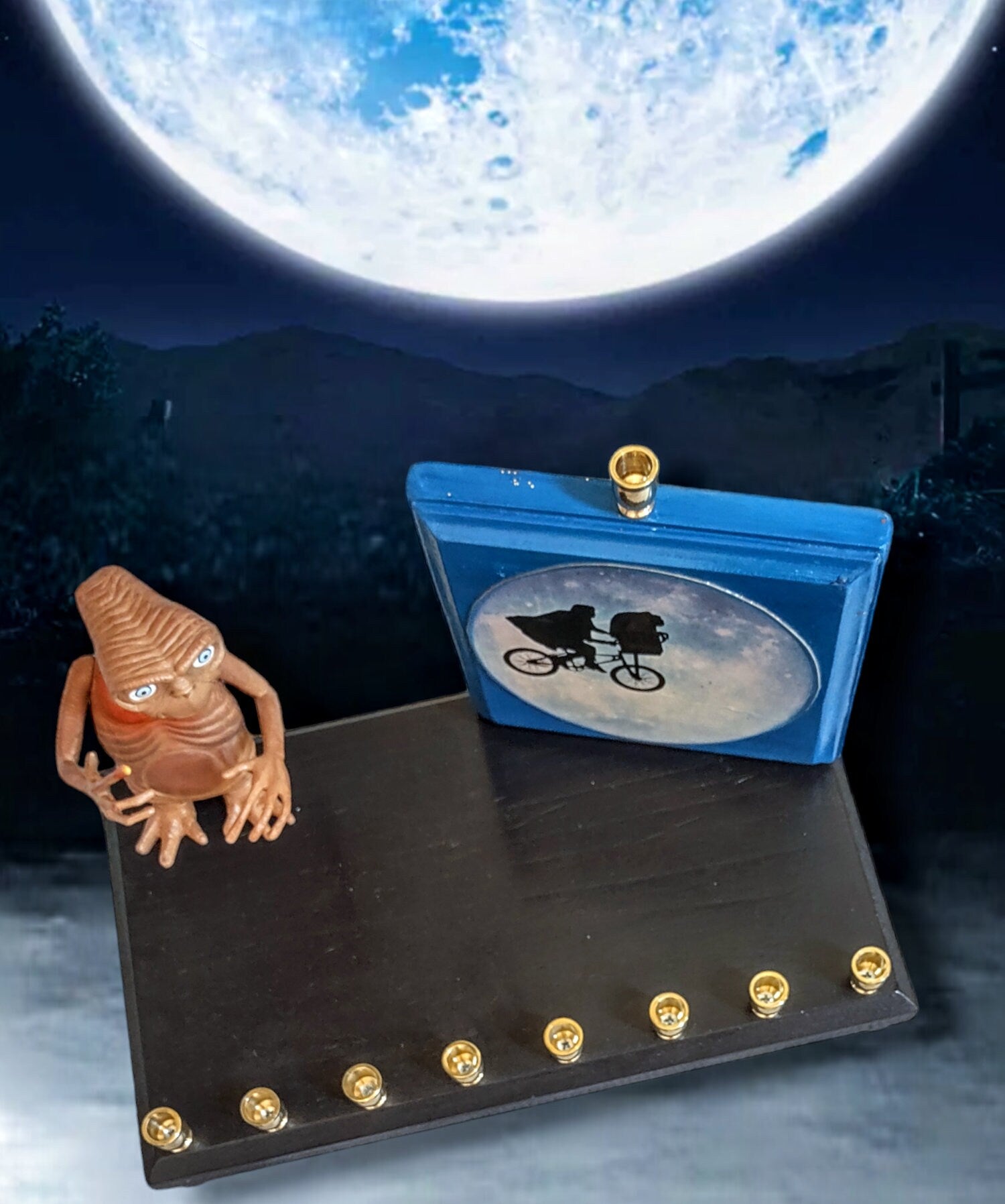 Hand-crafted E.T. Menorah from repurposed E.T. toy figure, painted wood plaque with ET silhouette, wood base, wood feet, brass candle cups, and acrylic paint.