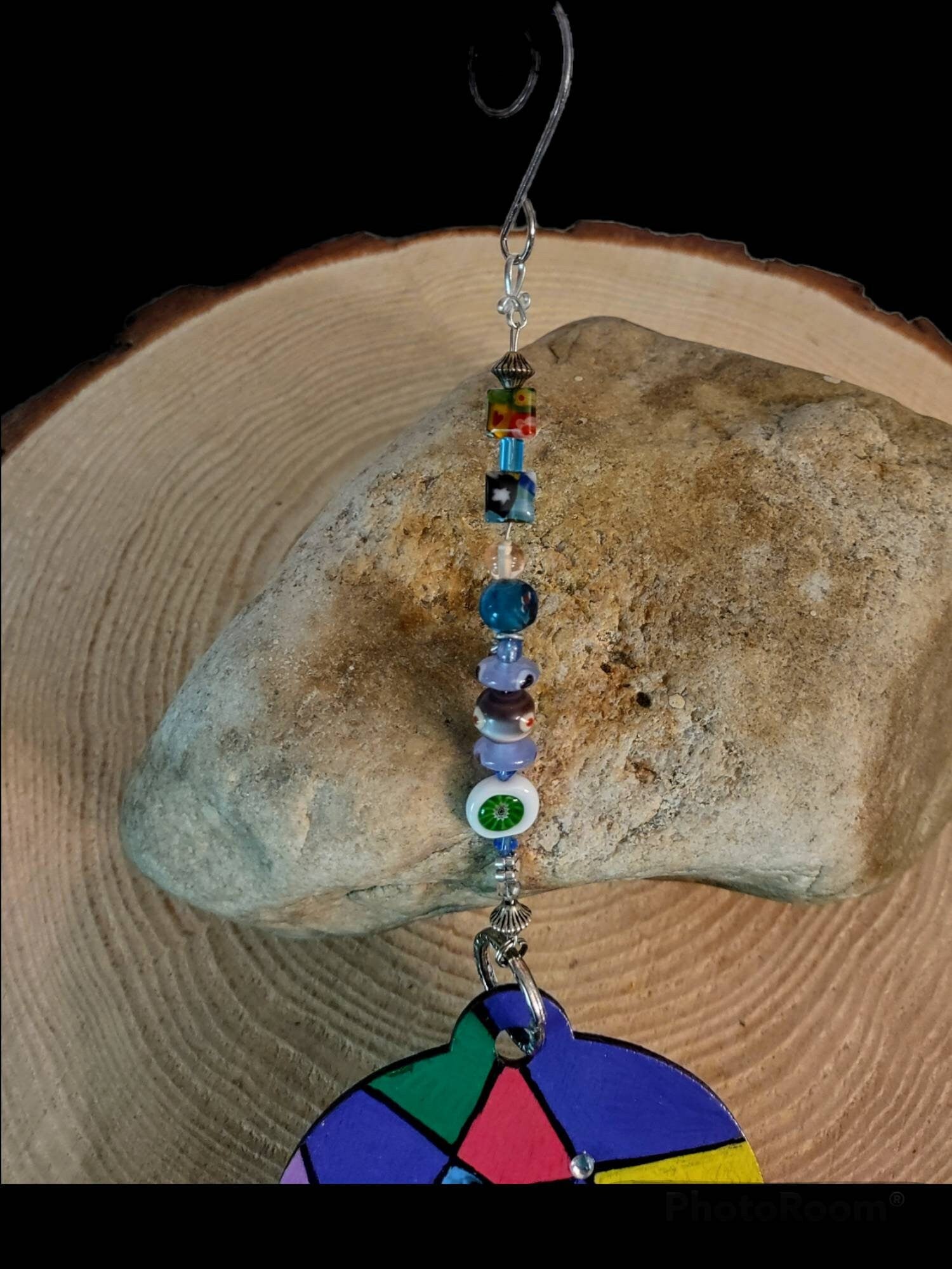 Hand painted wooden Hamsa and Mezuzah case in faux stained class with rhinestones.