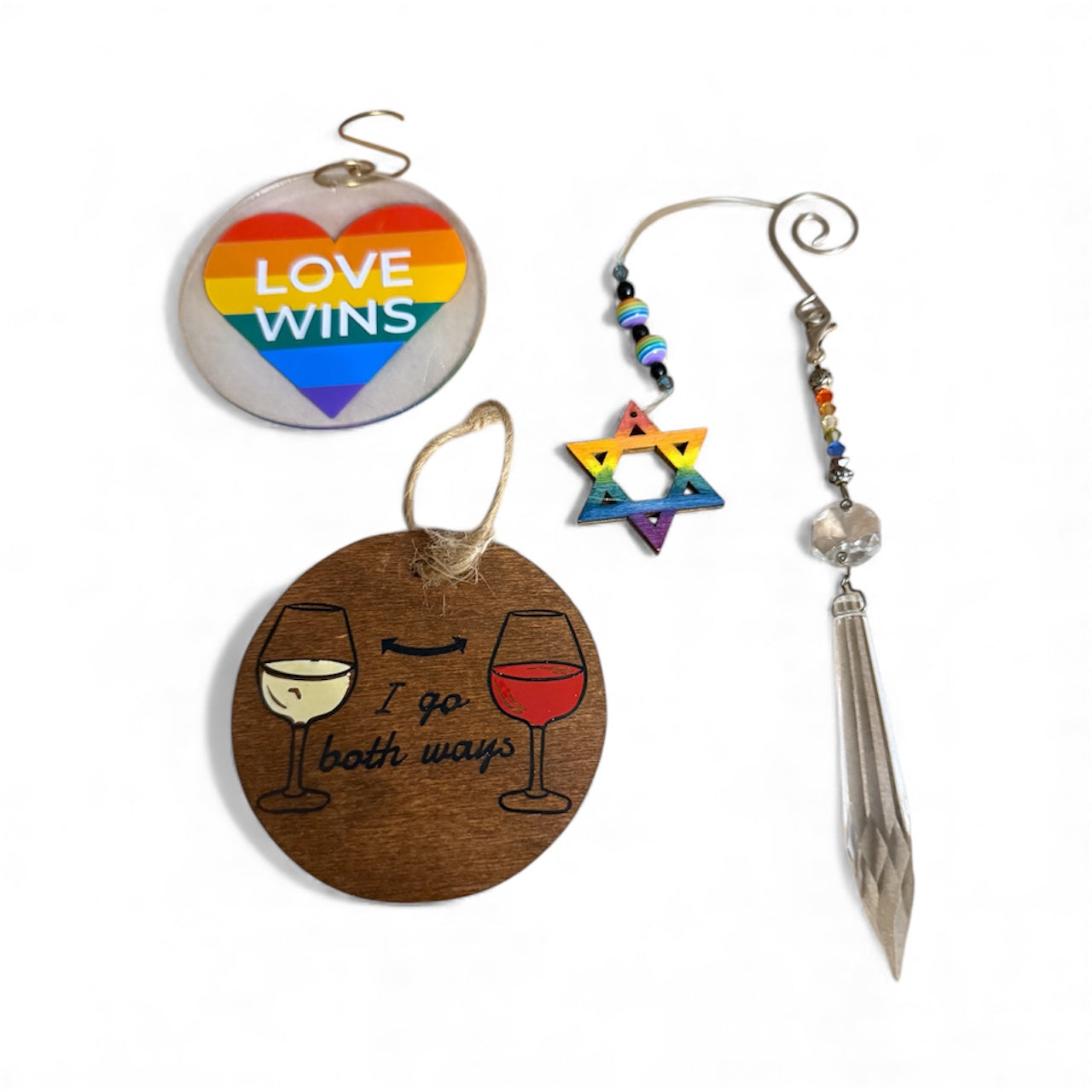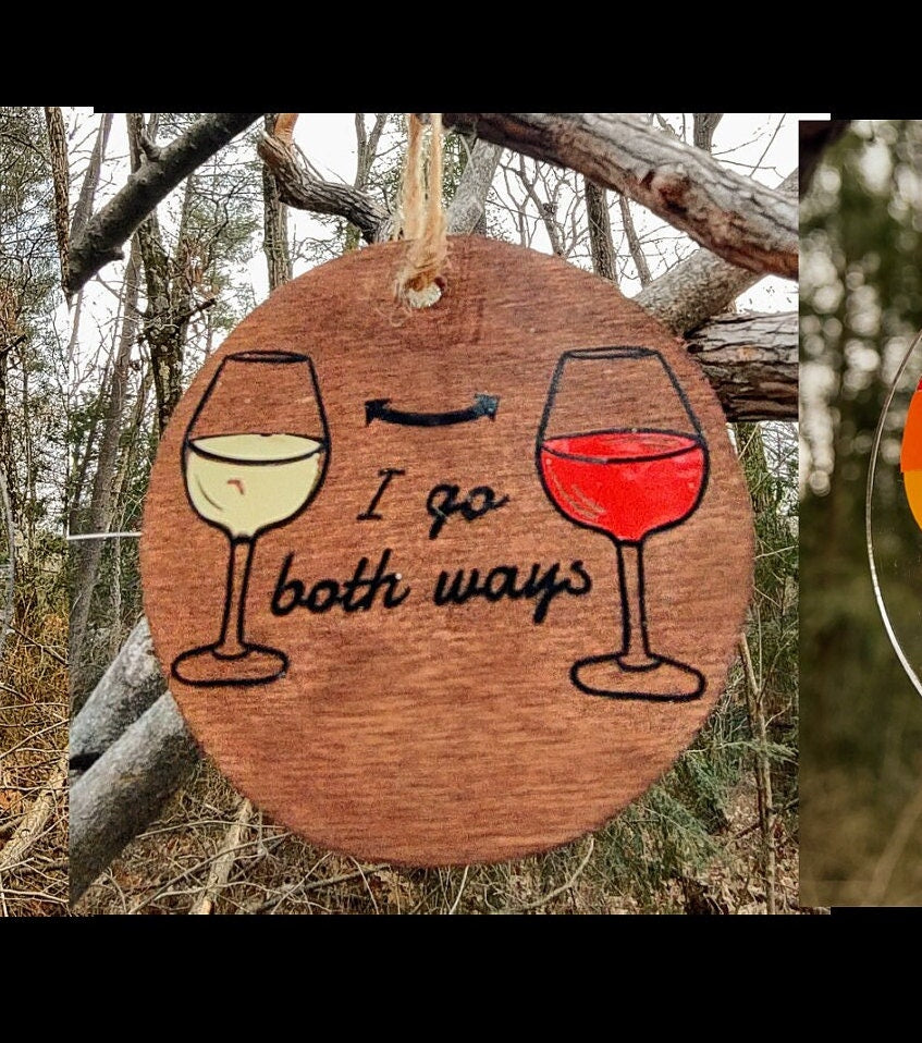 Handcrafted ornament decorations made from wood, wood stain, acrylic paint, wire, acrylic beads, rhinestones, Glitter, and/or vinyl. Personalization available. Measure 2.5” by 3-6” long See menu options for availability.