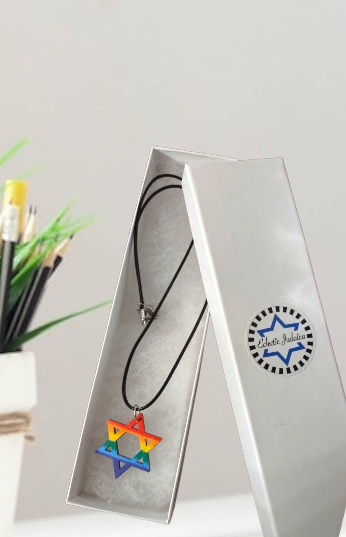 Rainbow wood painted necklace (20-inch necklace length) with choice of Hamsa or six-pointed Jewish Star, canvas rope and lobster claw clasp.