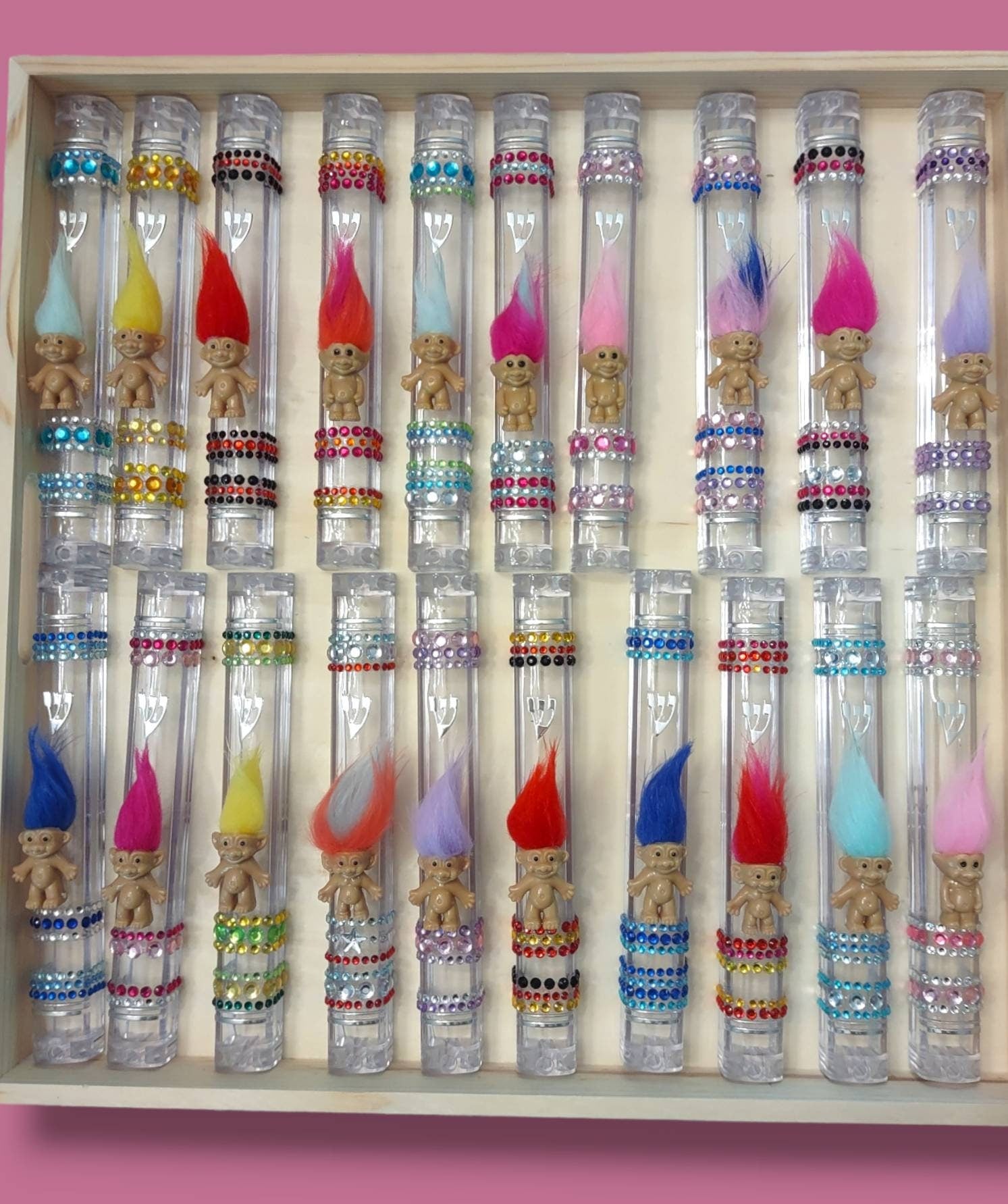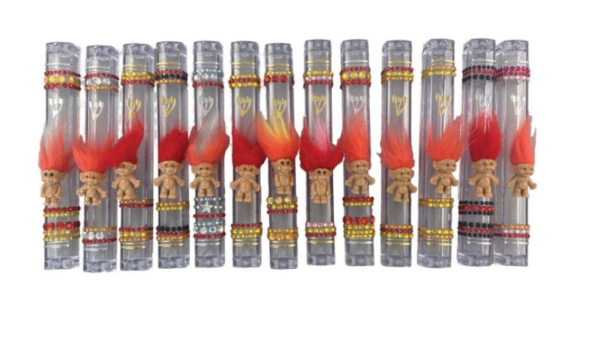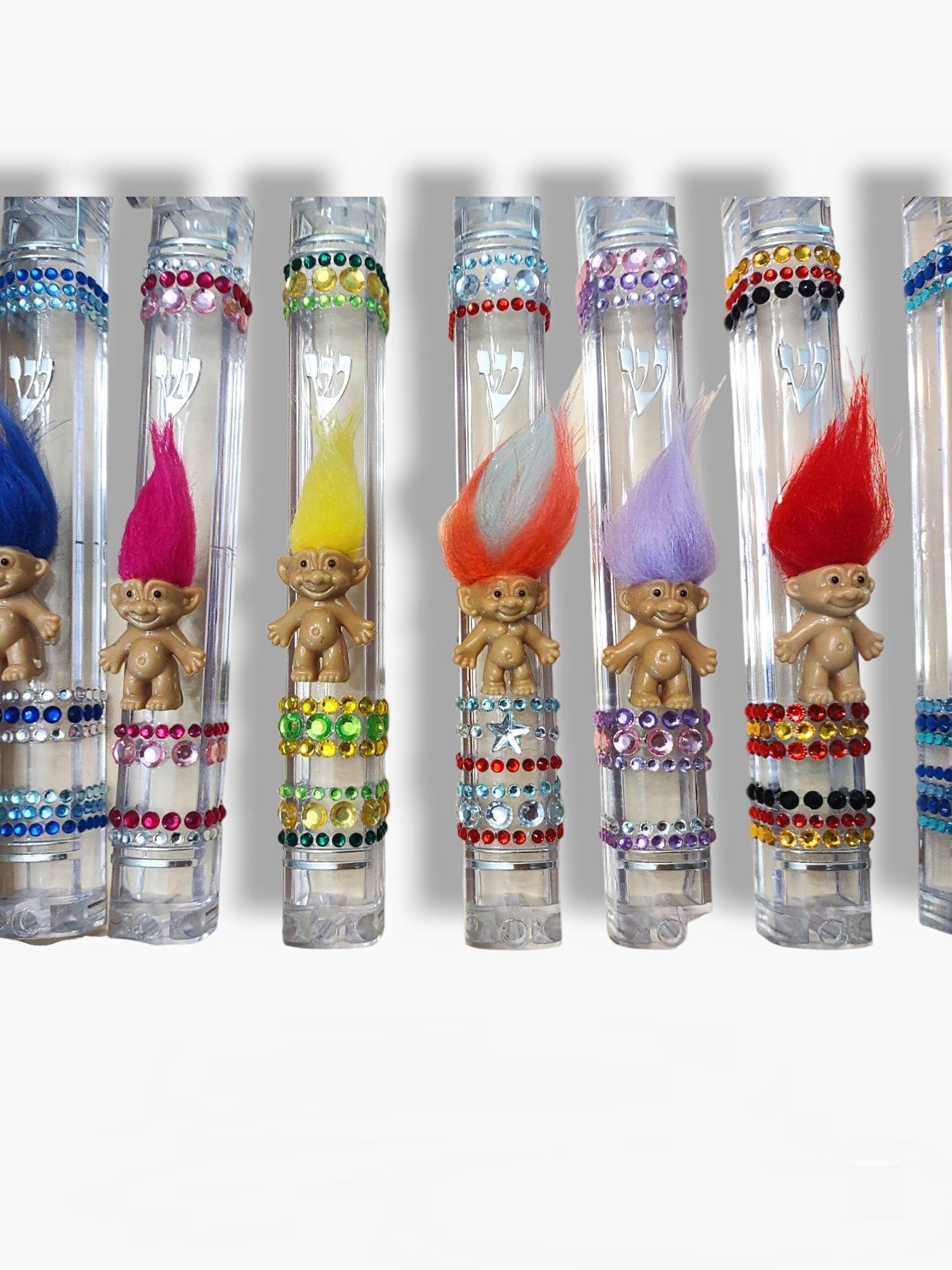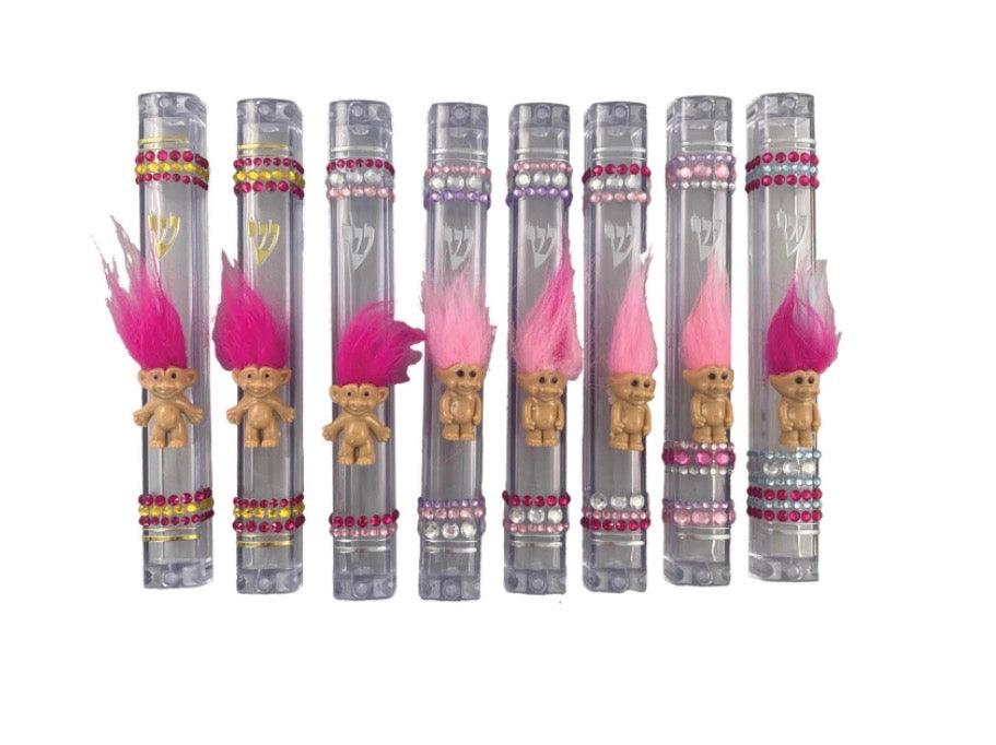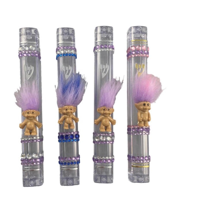 Acrylic Mezuzah frame with vintage trolls and sealed rhinestones.