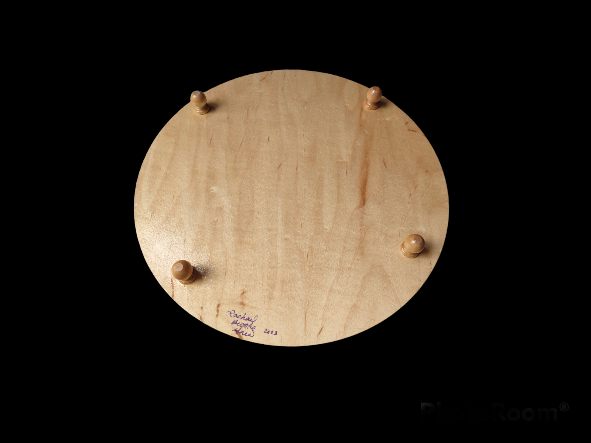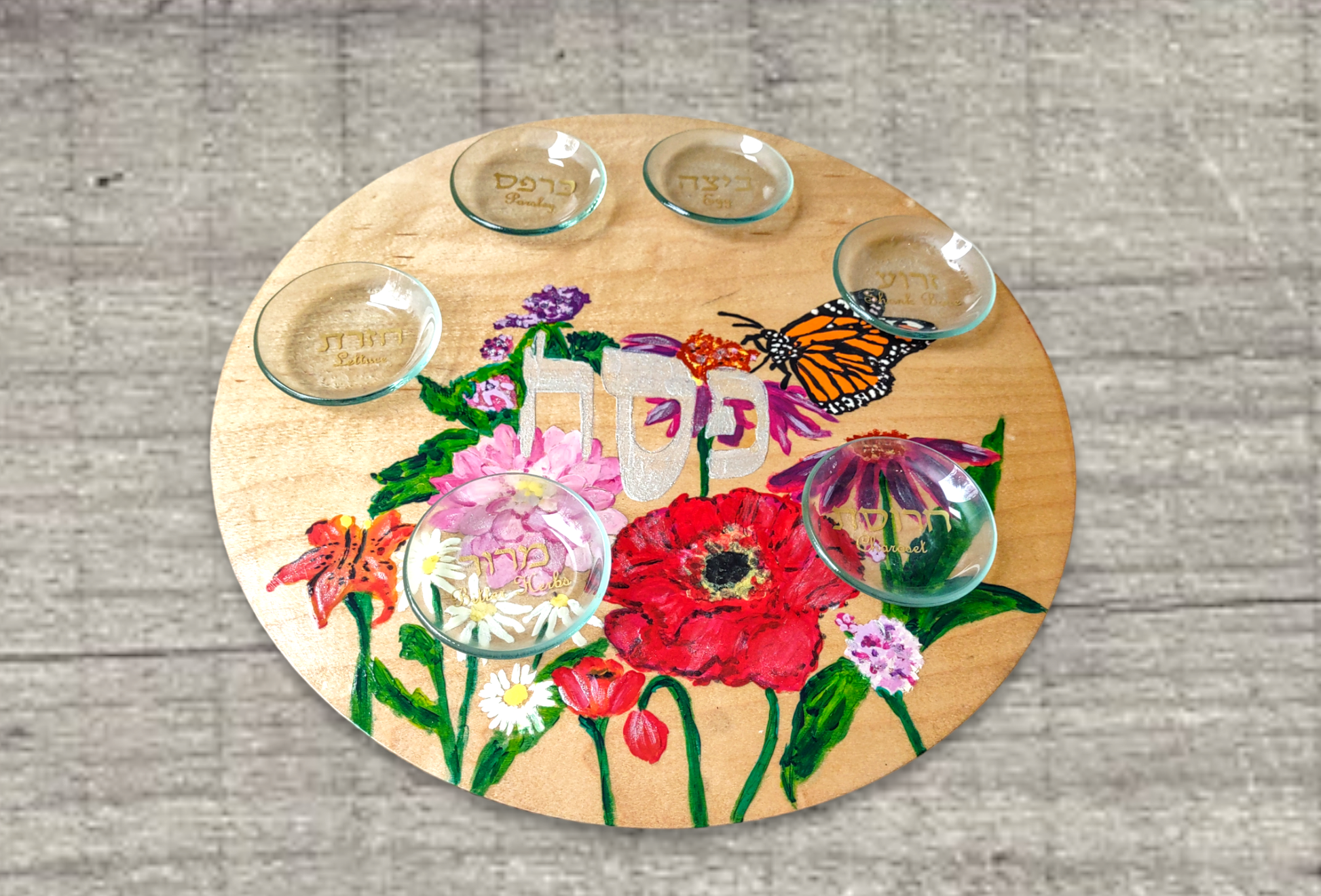 Hand-painted Beautiful Flowers and Butterfly and “Pesach” in Hebrew on a 12” diameter/ 1.5" Height hardwood plate with wooden feet.