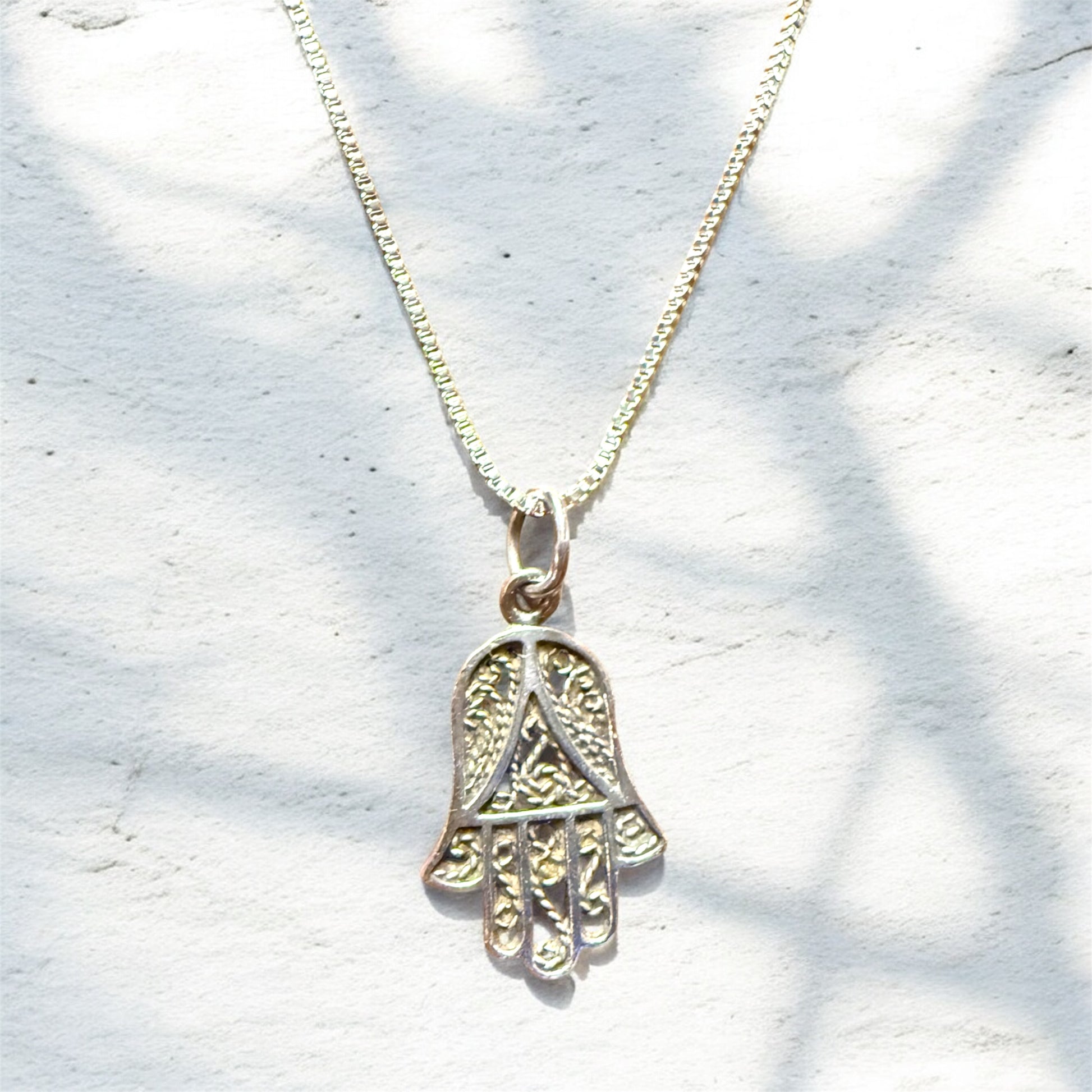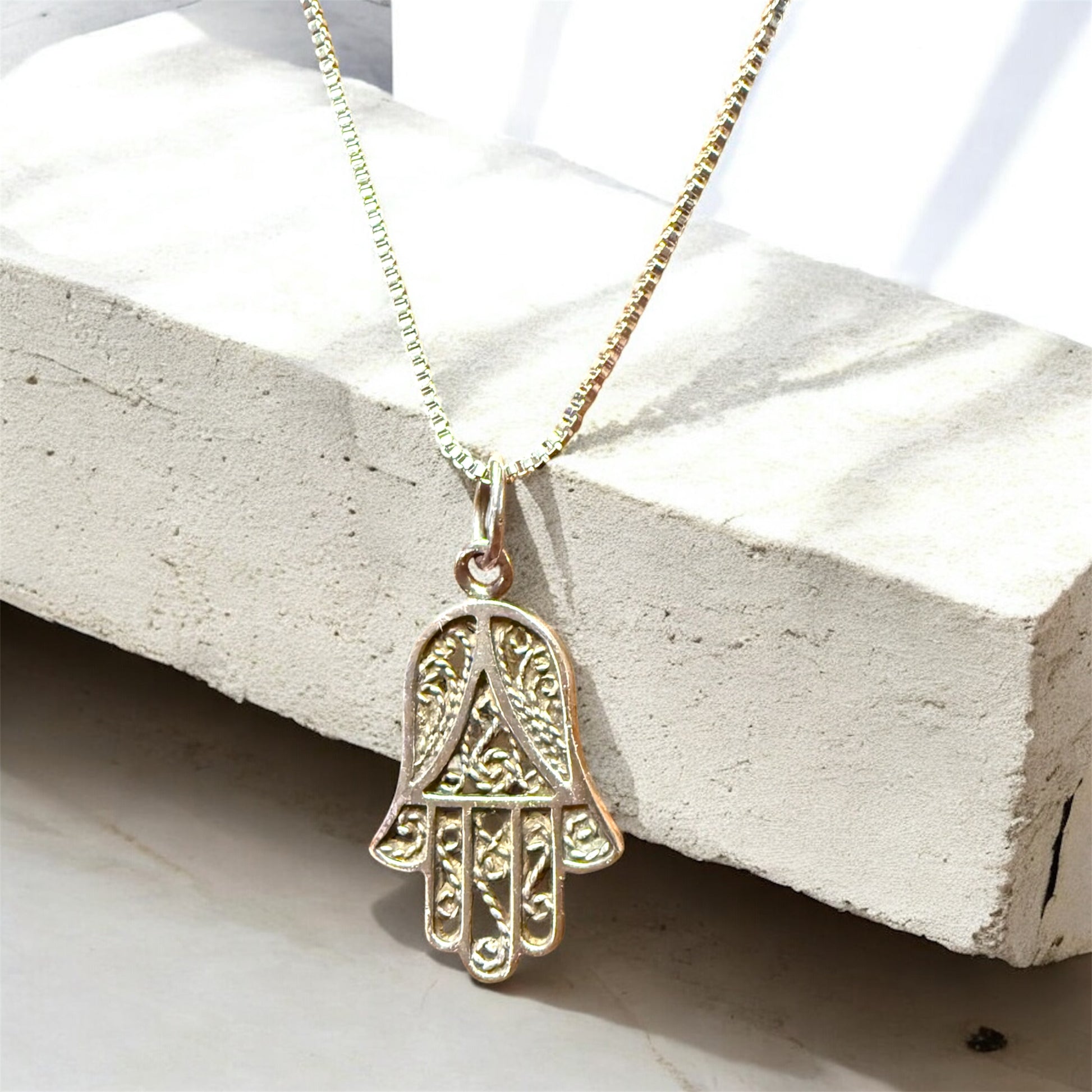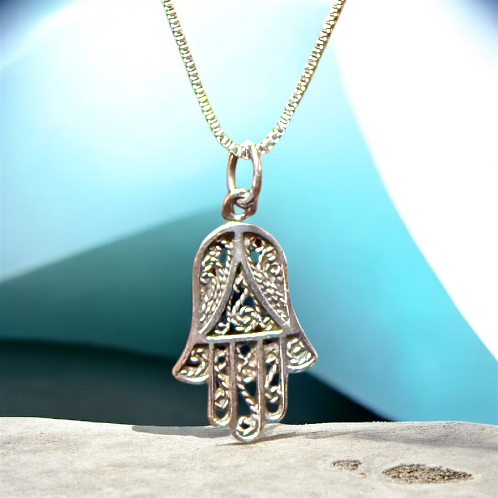 Beautiful vintage filagree hamsa pendant necklace in sterling silver on an 18" sterling box chain necklace.