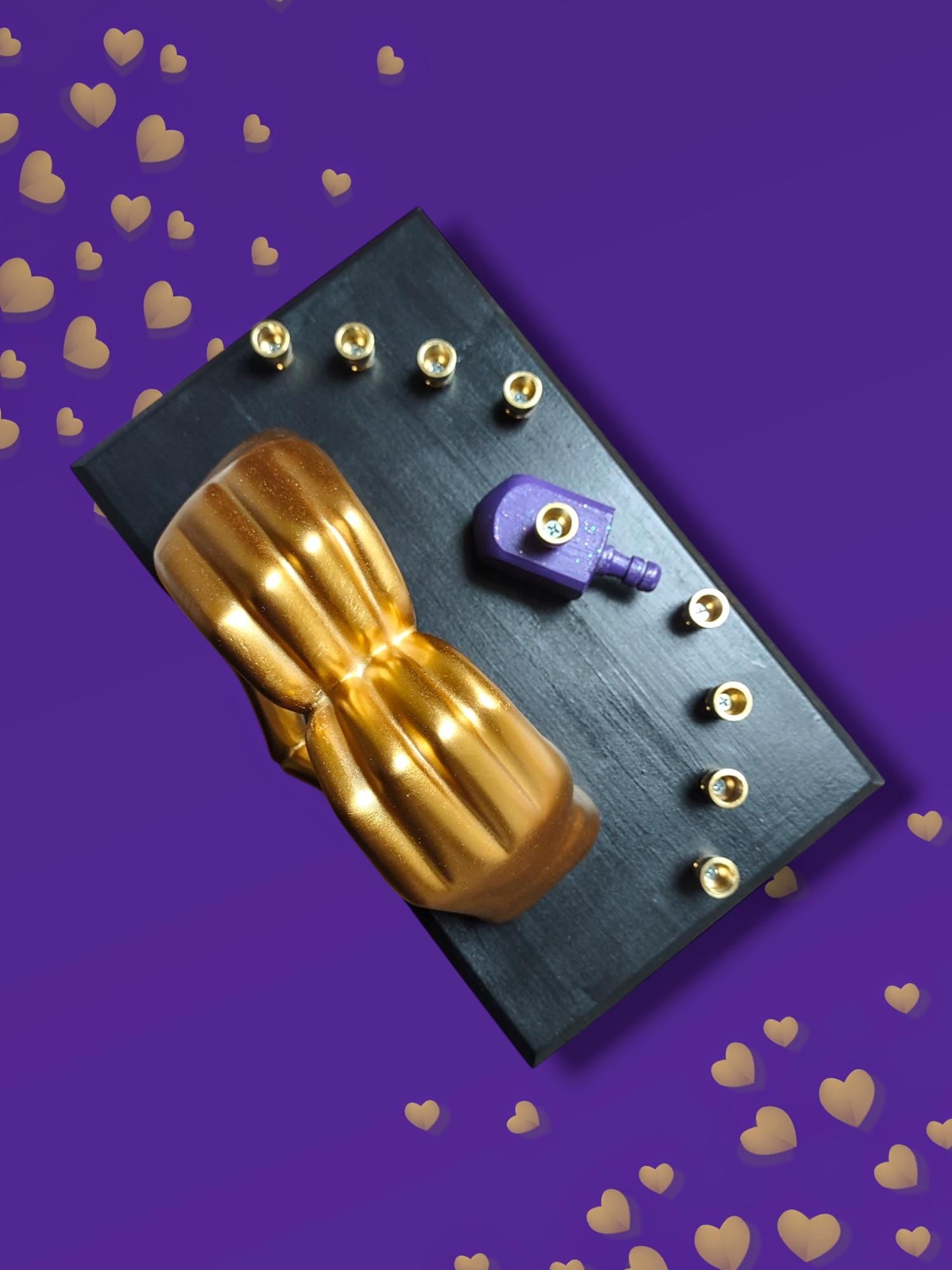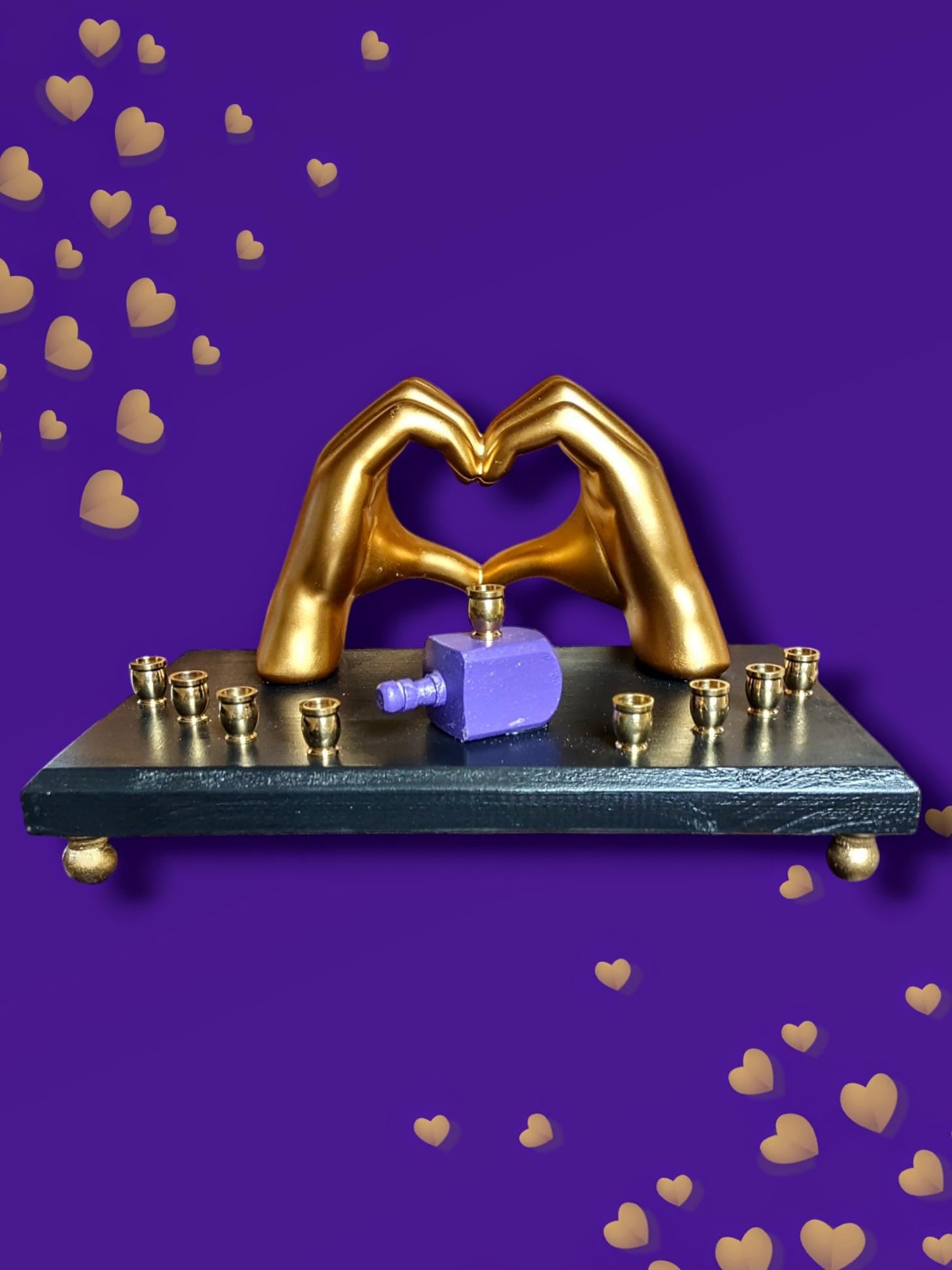 Black base, gold feet, purple glitter dreidle, golden I love you hands with brass candle cups.