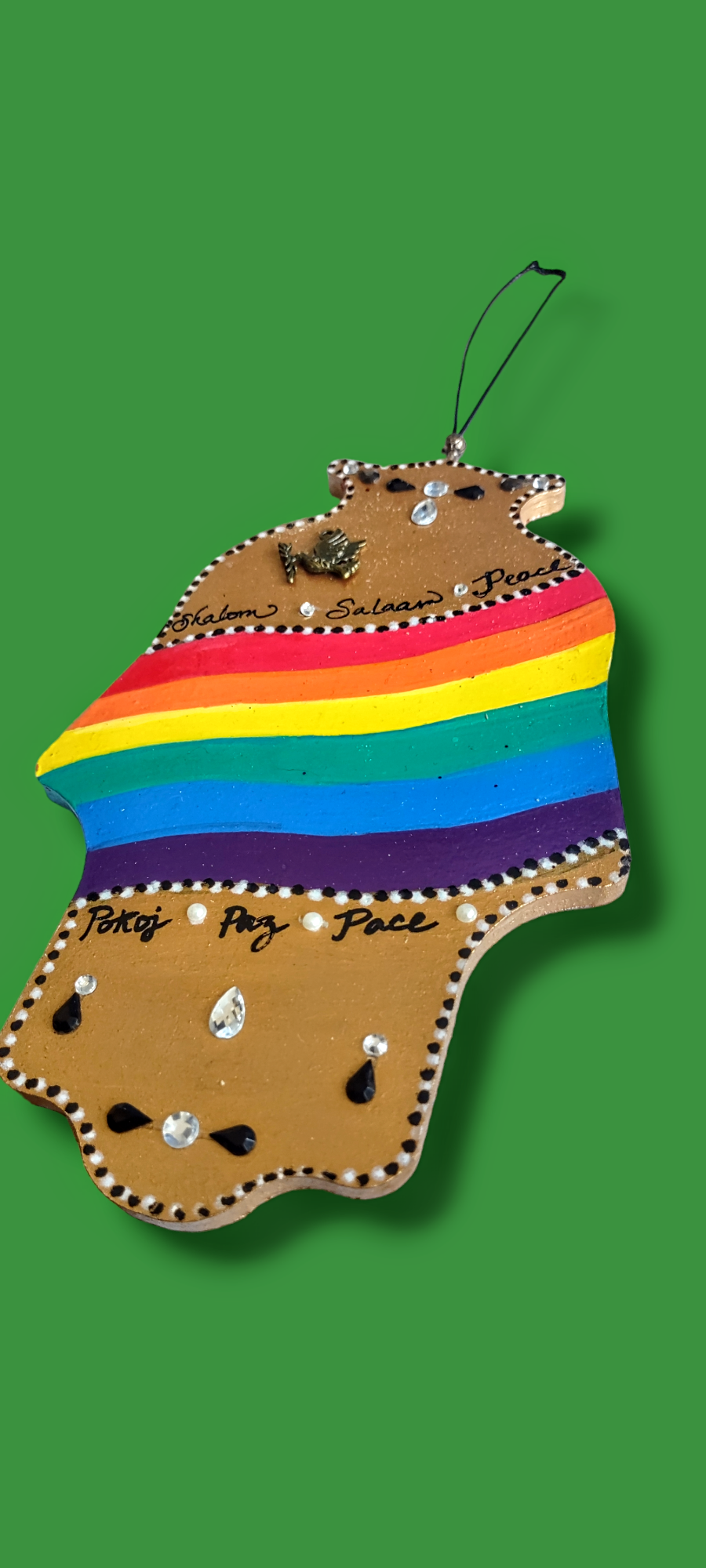 Handpainted with the word "Peace" in english, hebrew, arabic, polish, Spanish and Italian.