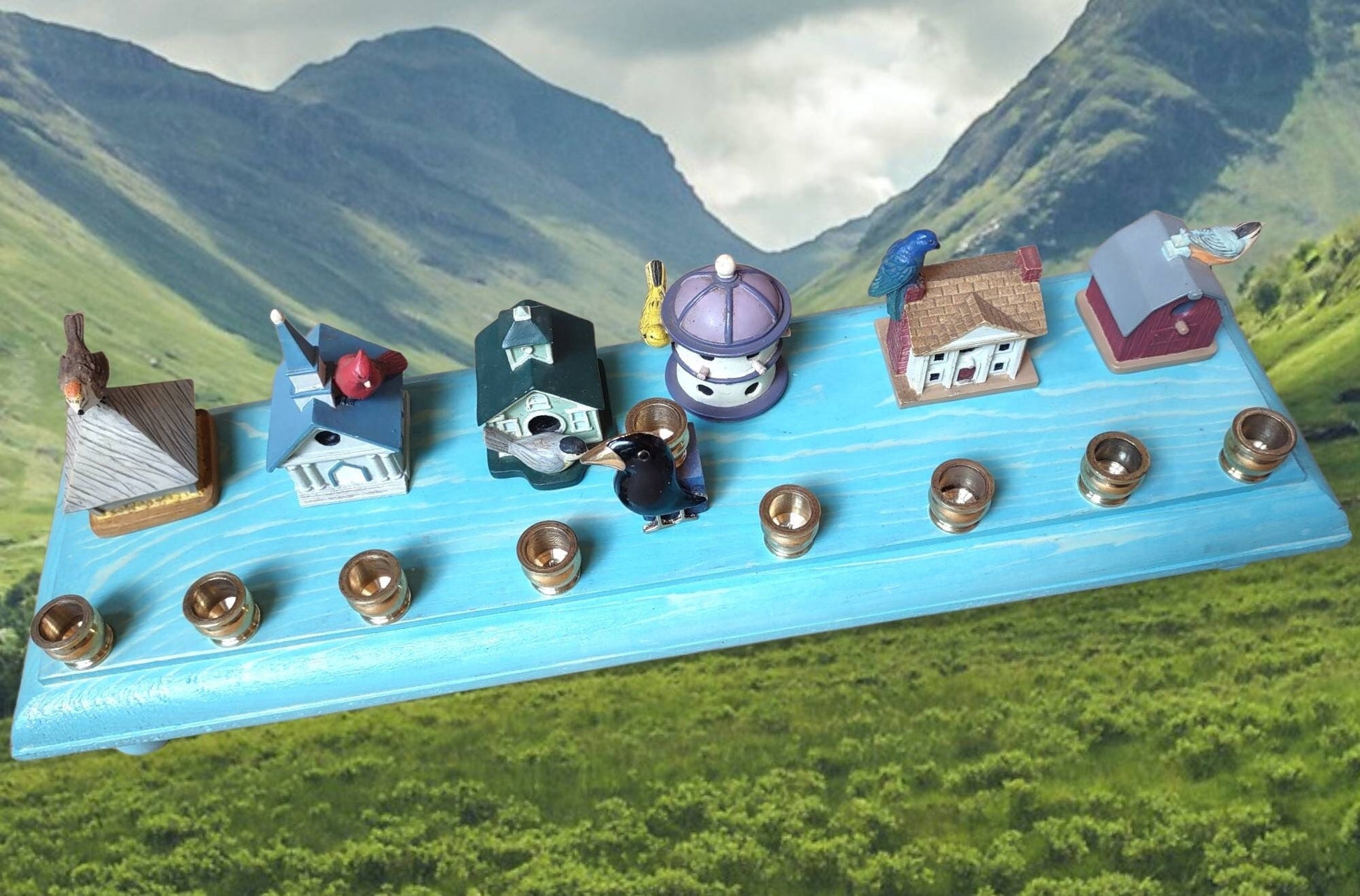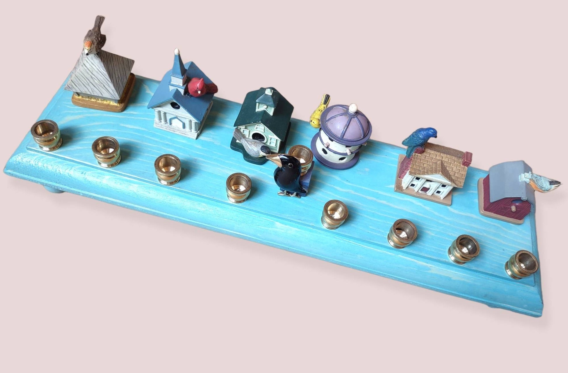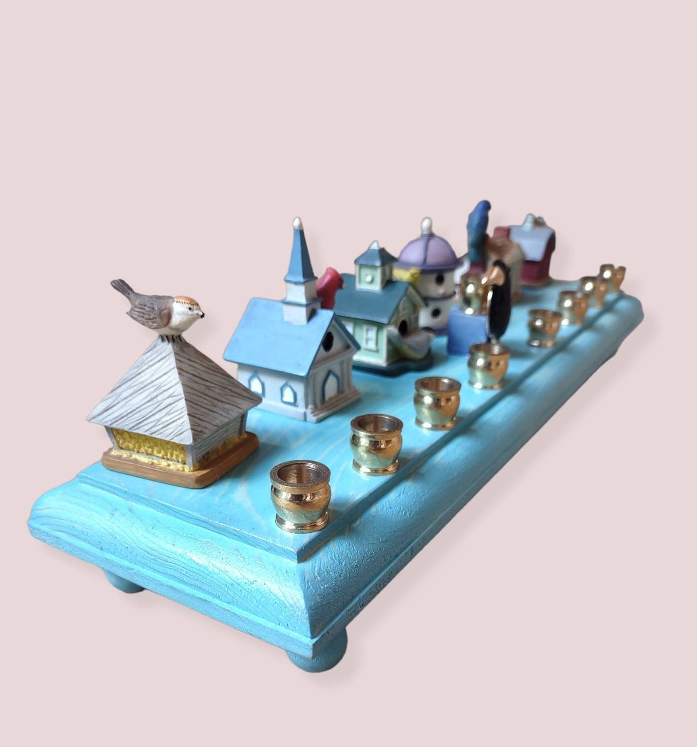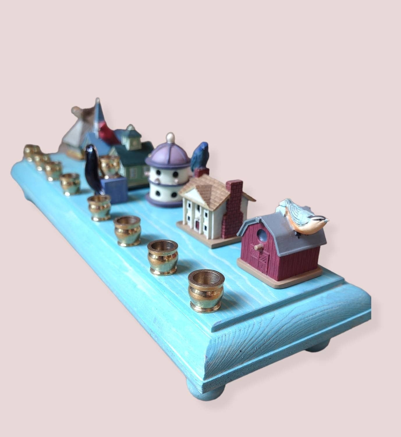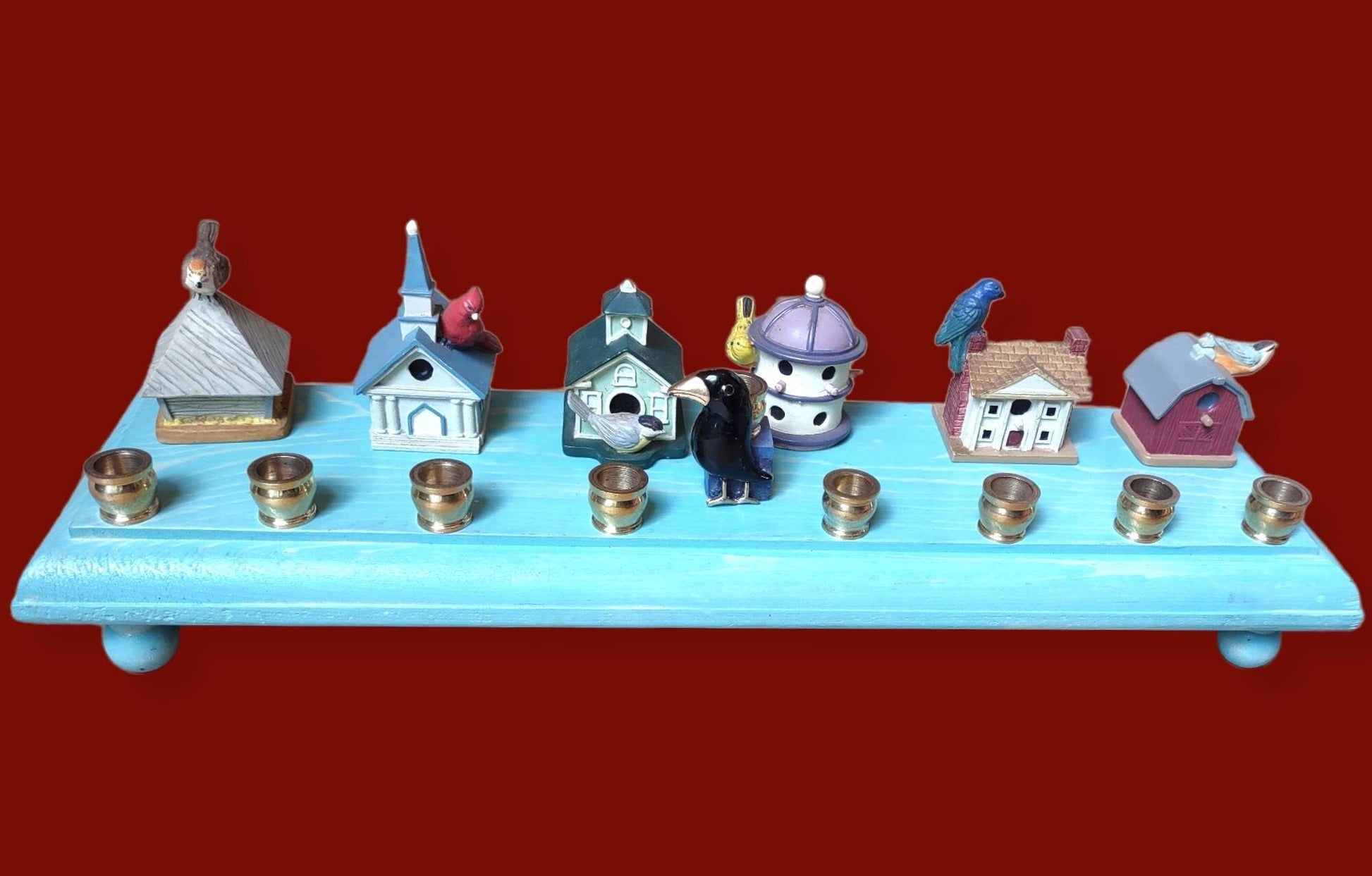 Hand-crafted Birdhouse Figure Menorah from repurposed collectible vintage Lenox ceramic birdhouses, a crow-adorned shamash, wood plaque, brass candle cups, acrylic paint and wooden feet.