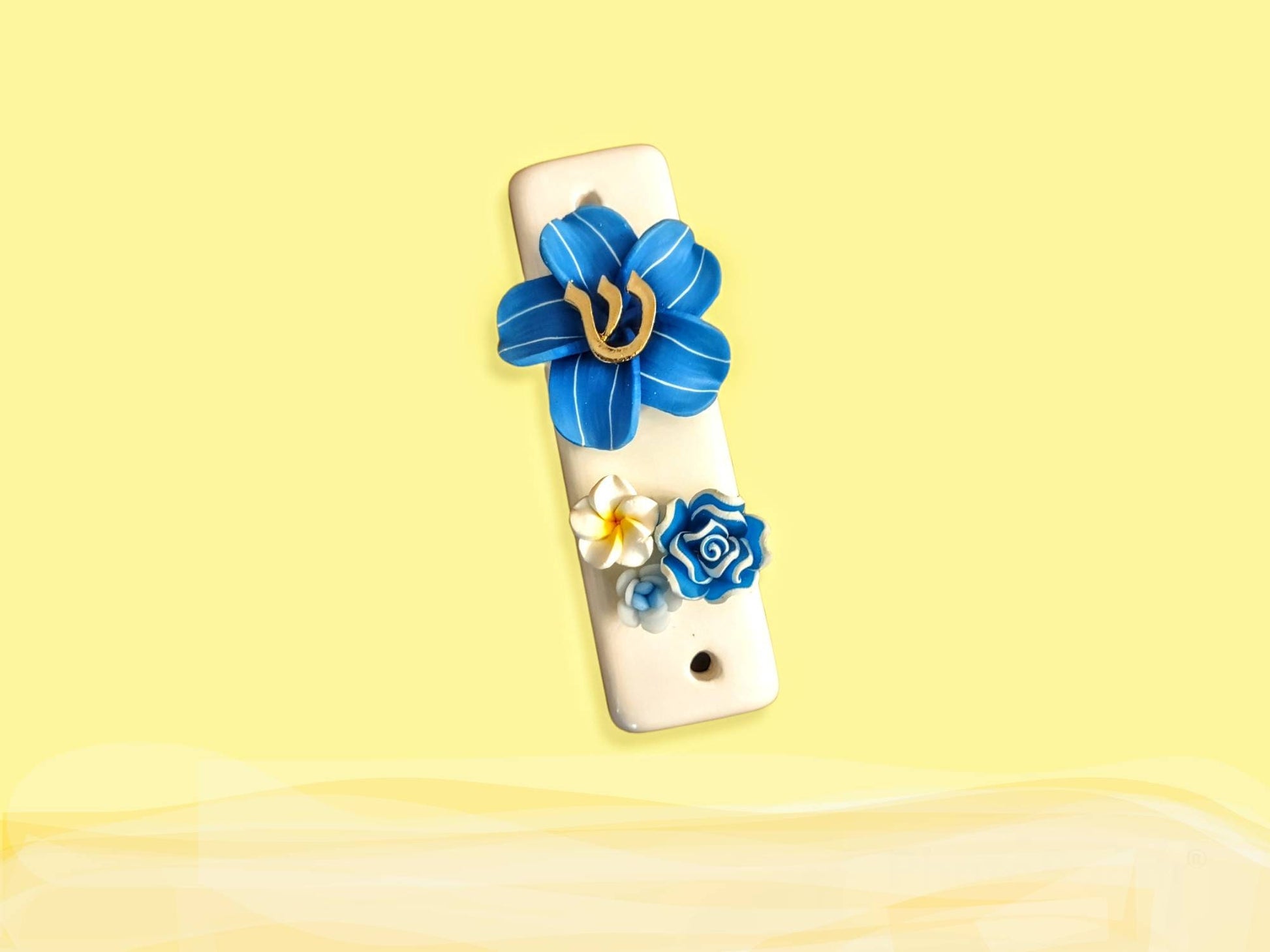 Ceramic mezuzah case with silicone tropical flowers and metal Shin.