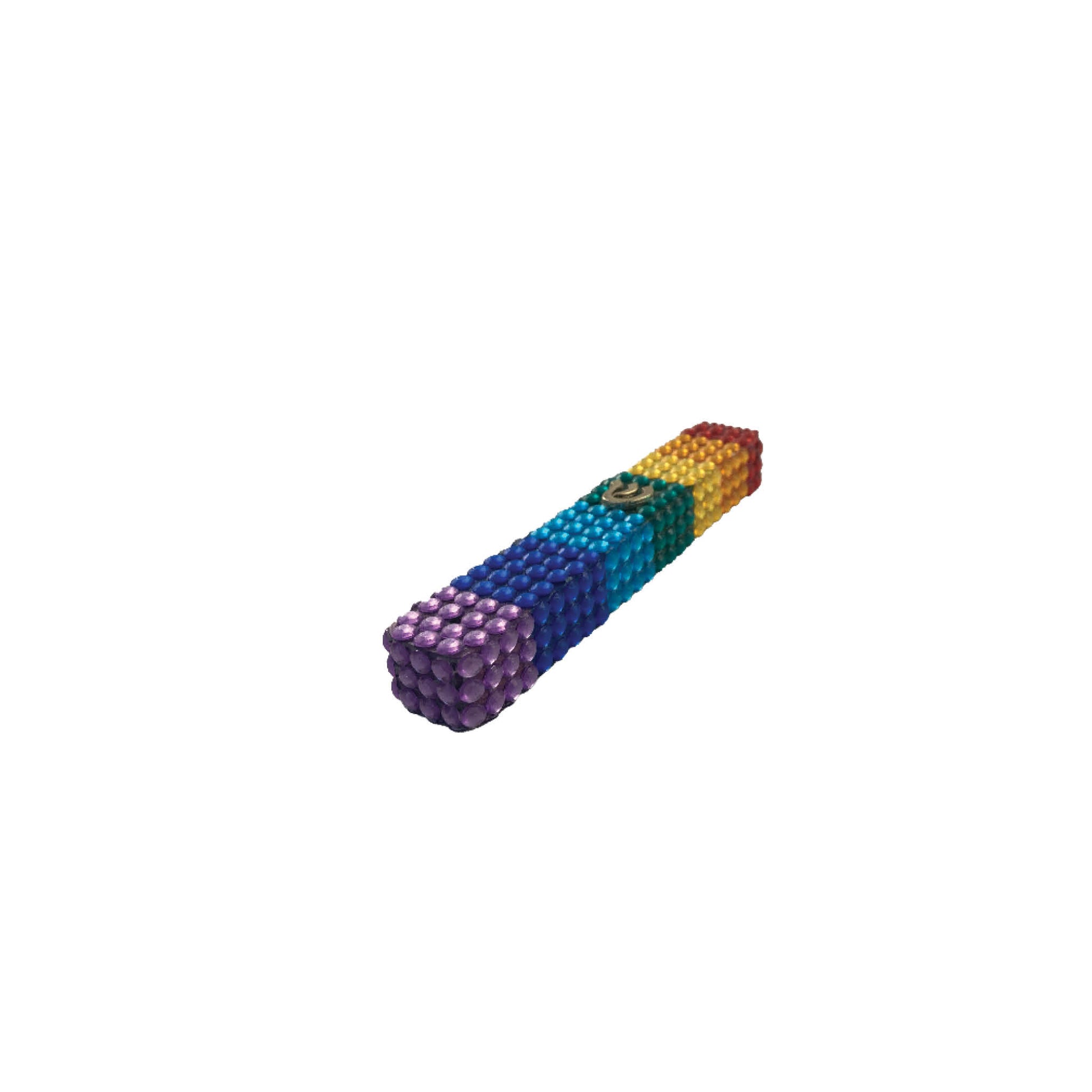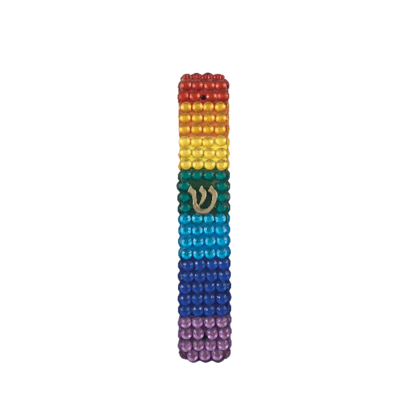 Acrylic mezuzah case covered in rainbow rhinestones and sealed.