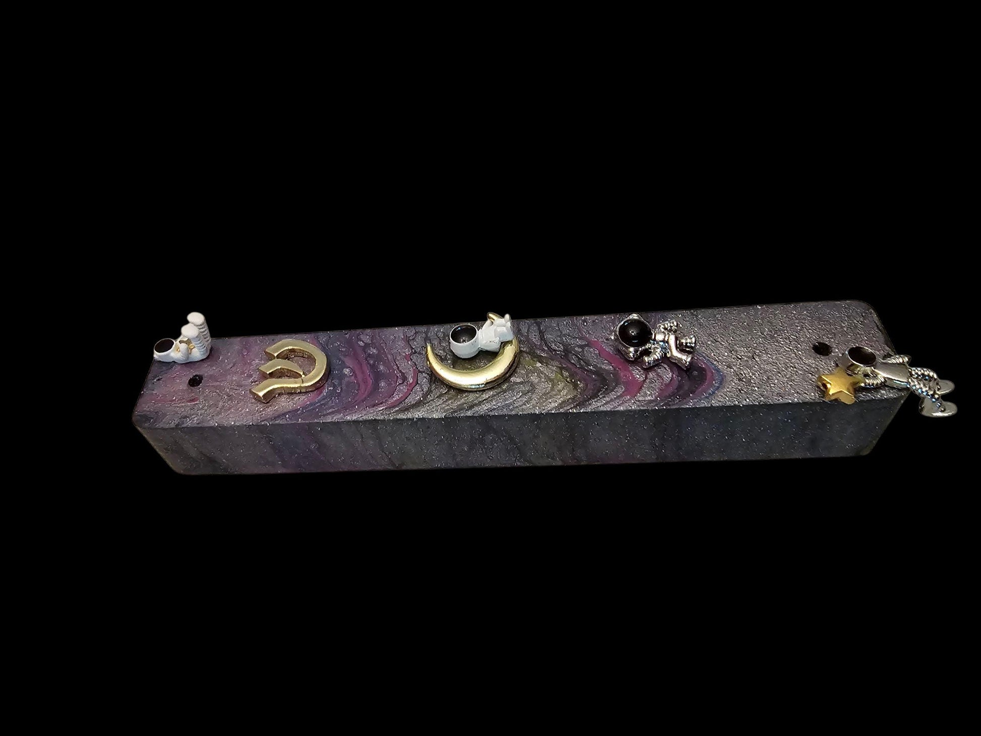 Wood Mezuzah case painted and sealed in sparkly black acrylic paint in paint pour method and decorated with astronaut charms.