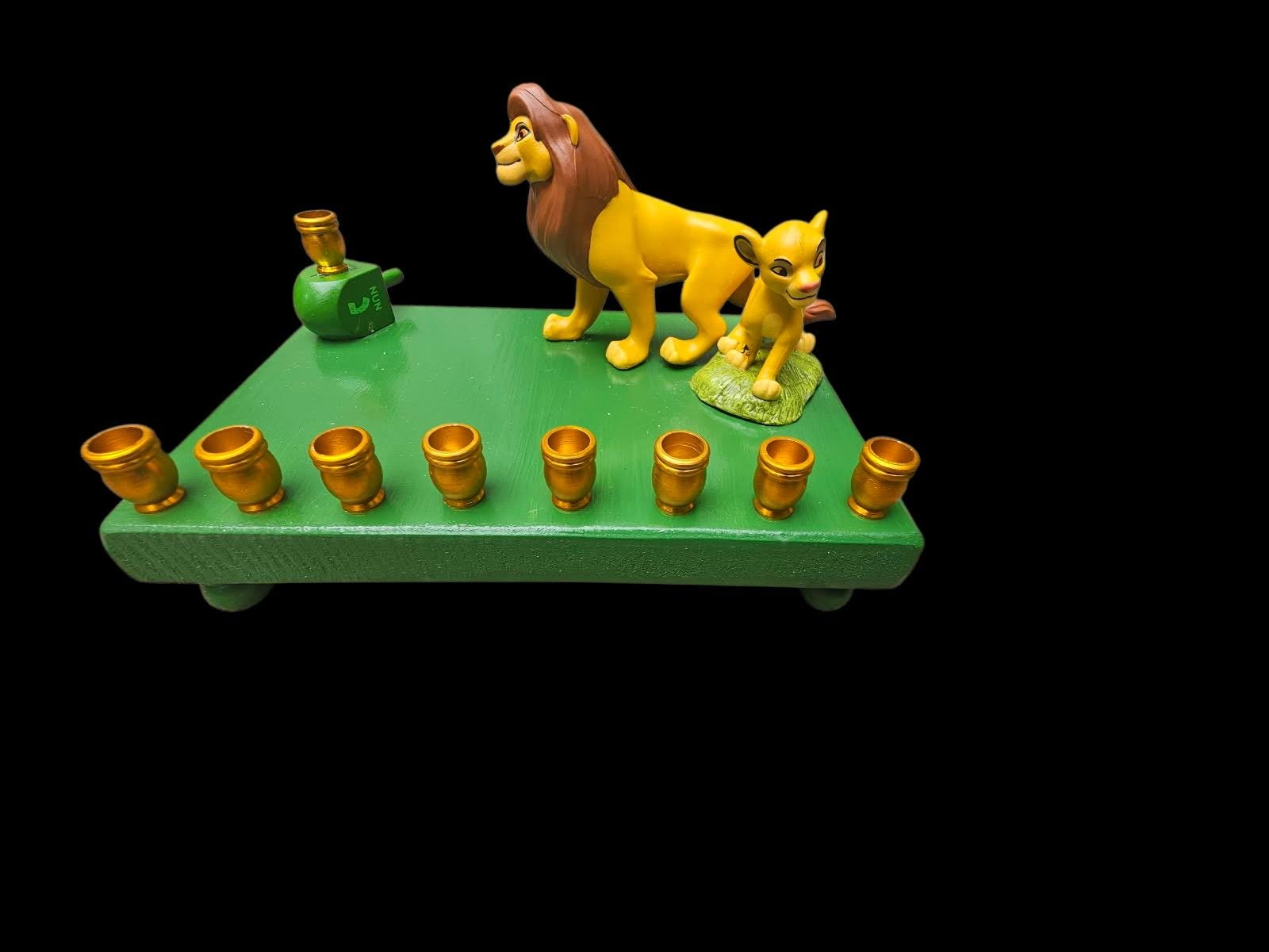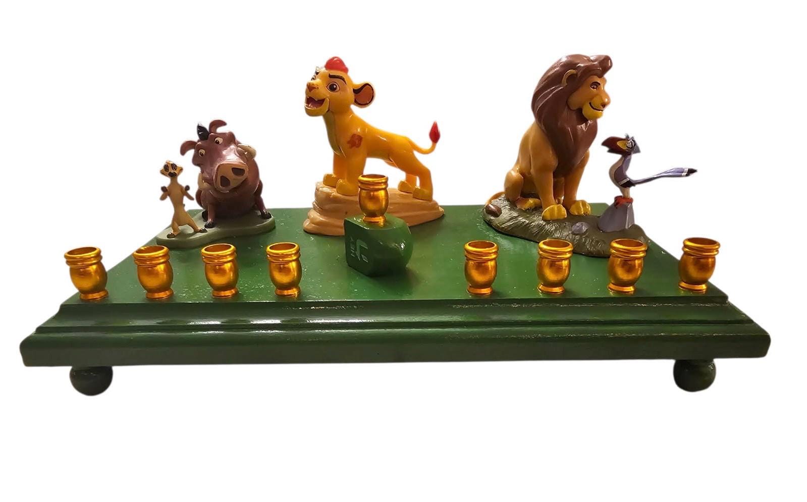 Hand-crafted Lion King Menorah from repurposed licensed Disney toy figures, wood plaque, gold aluminum candle cups, acrylic paint, and dreidel. Disney fans of young and old will adore this Hanukah centerpiece. Holds standard size Chanukah candles in sturdy cups.