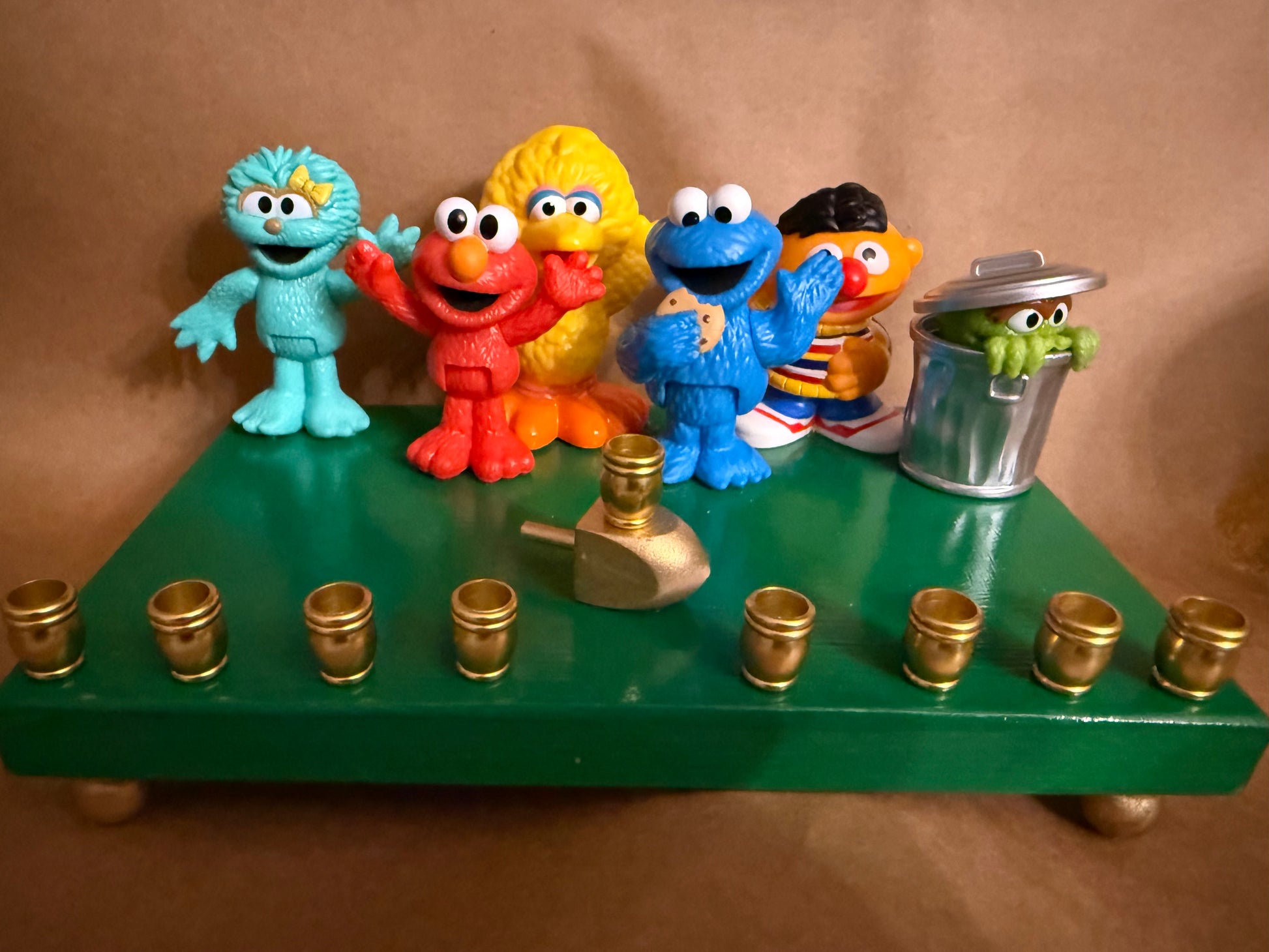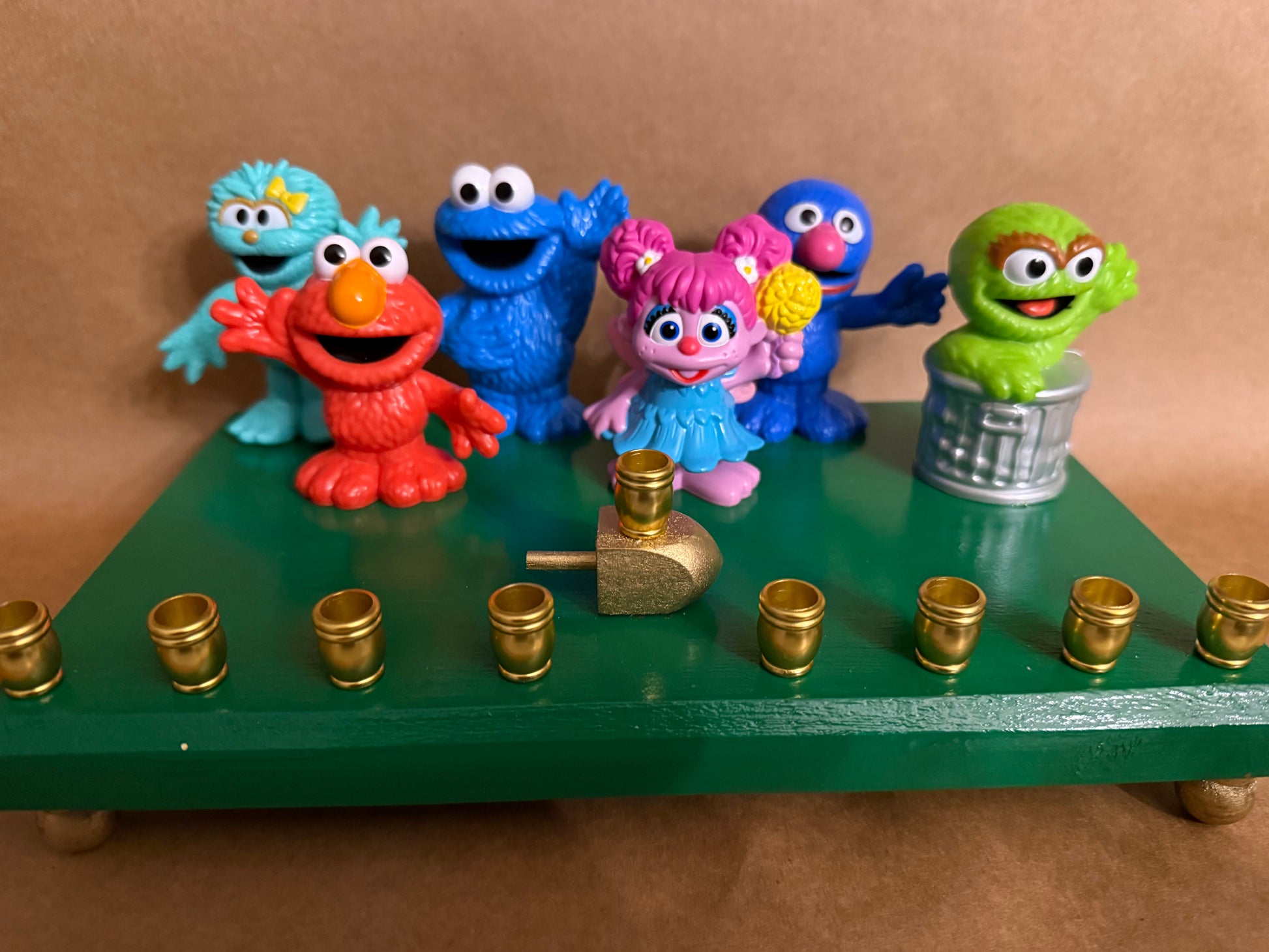 Hand-crafted Sesame Street menorahs from repurposed figures, gold-colored aluminum candle cups, wooden dreidels, and wooden feet.