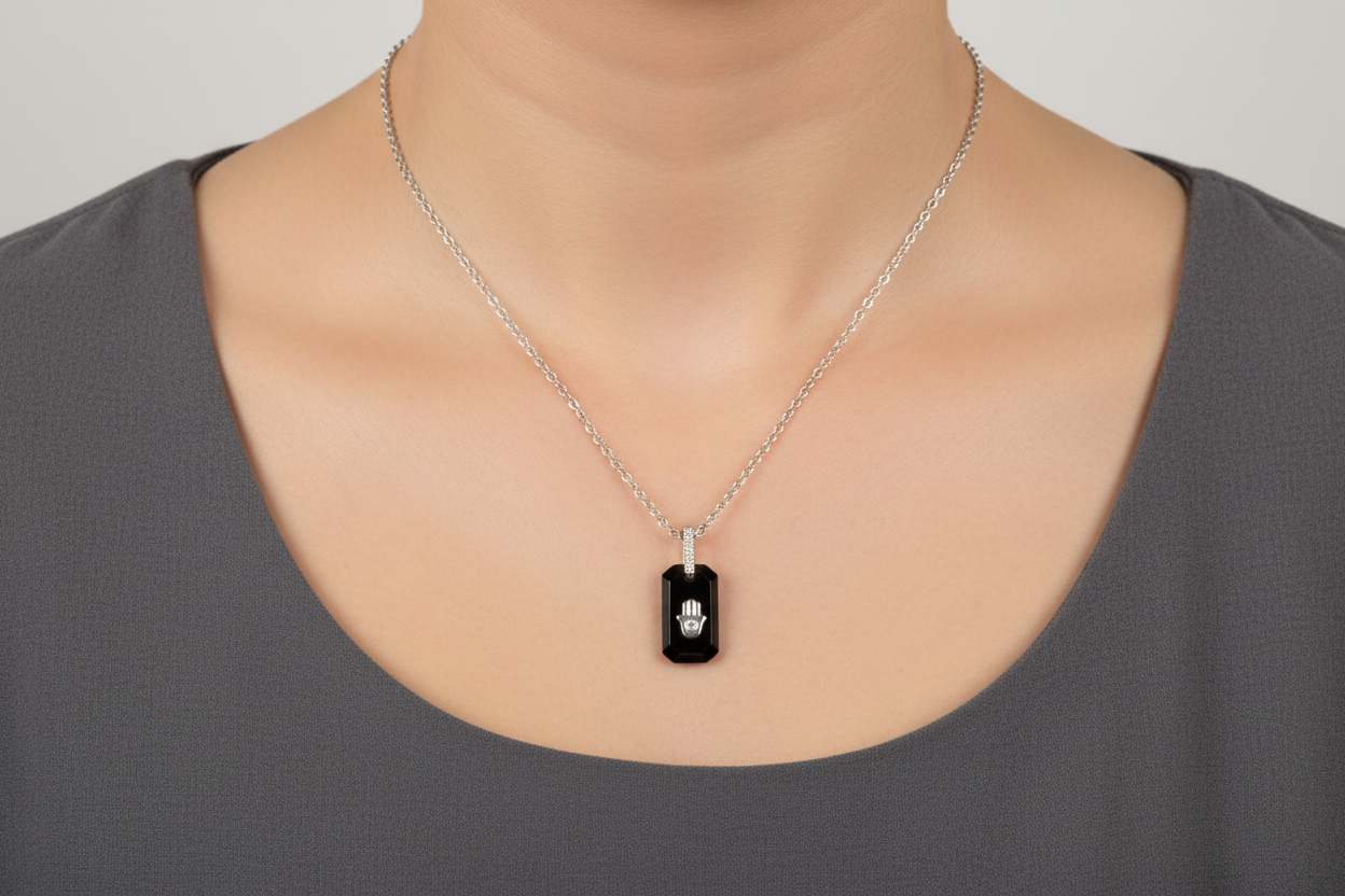 Black Onyx and CZ hamsa pendant sterling silver necklace