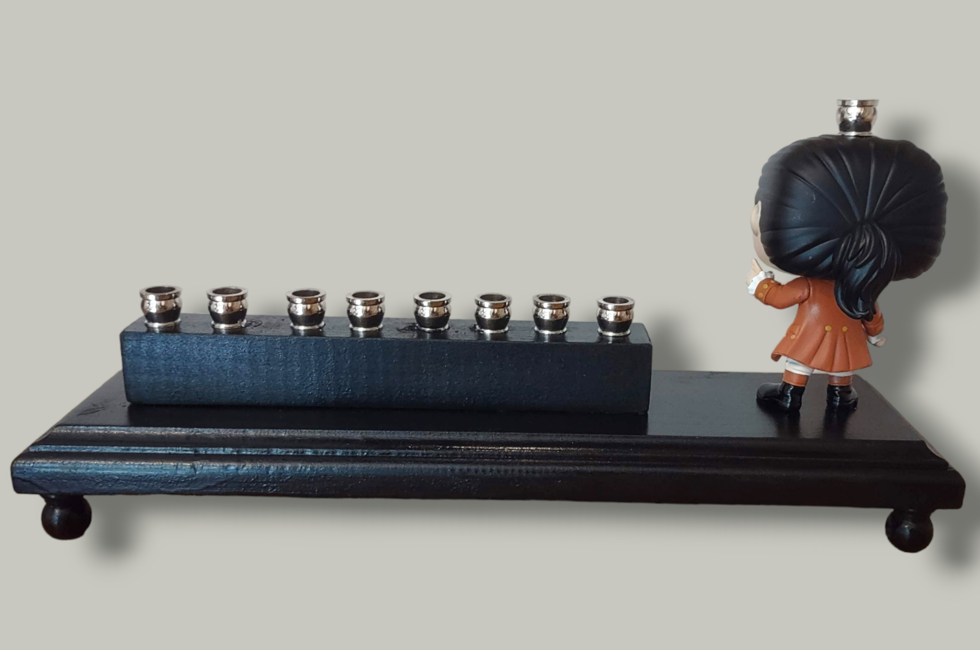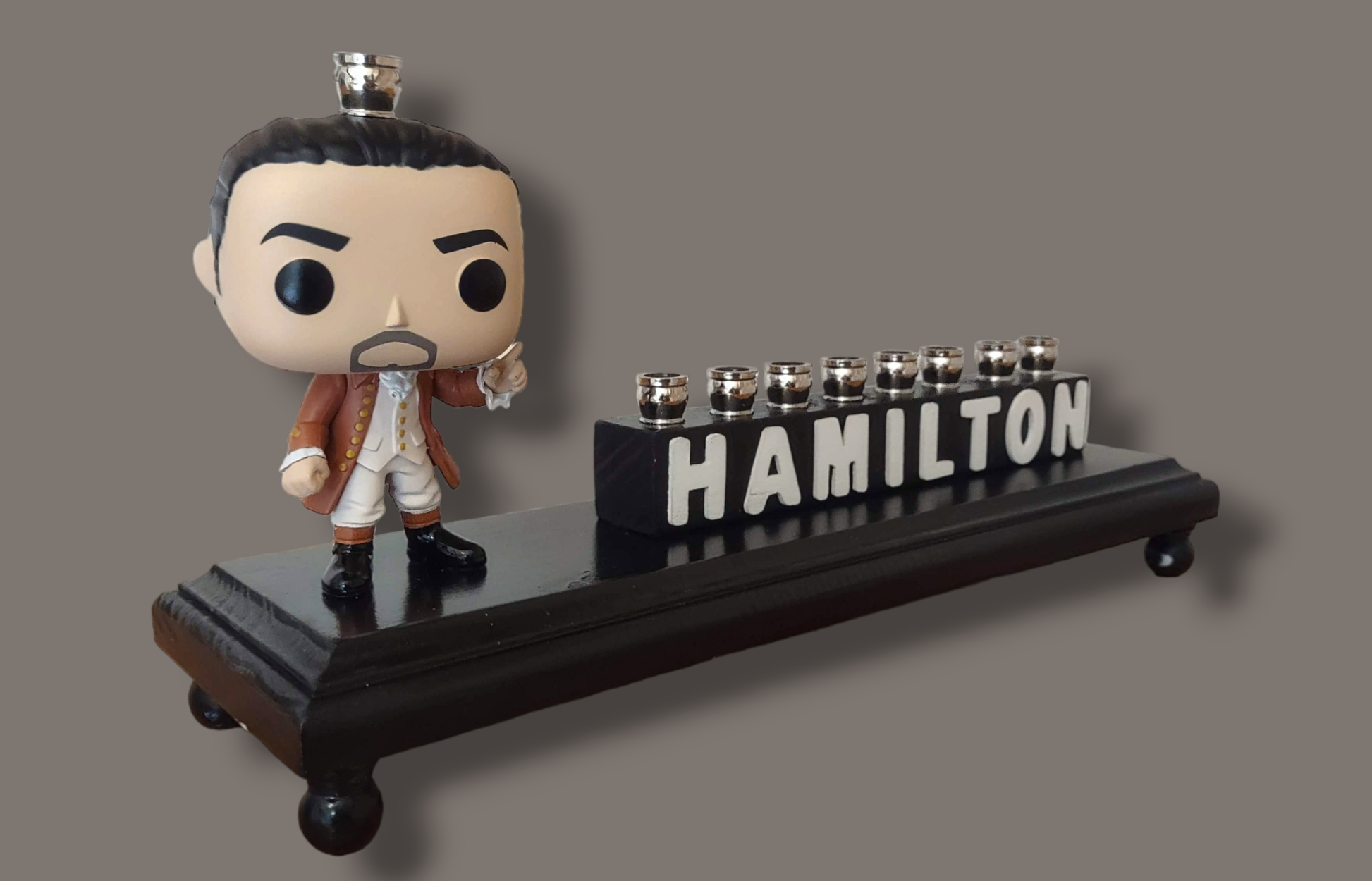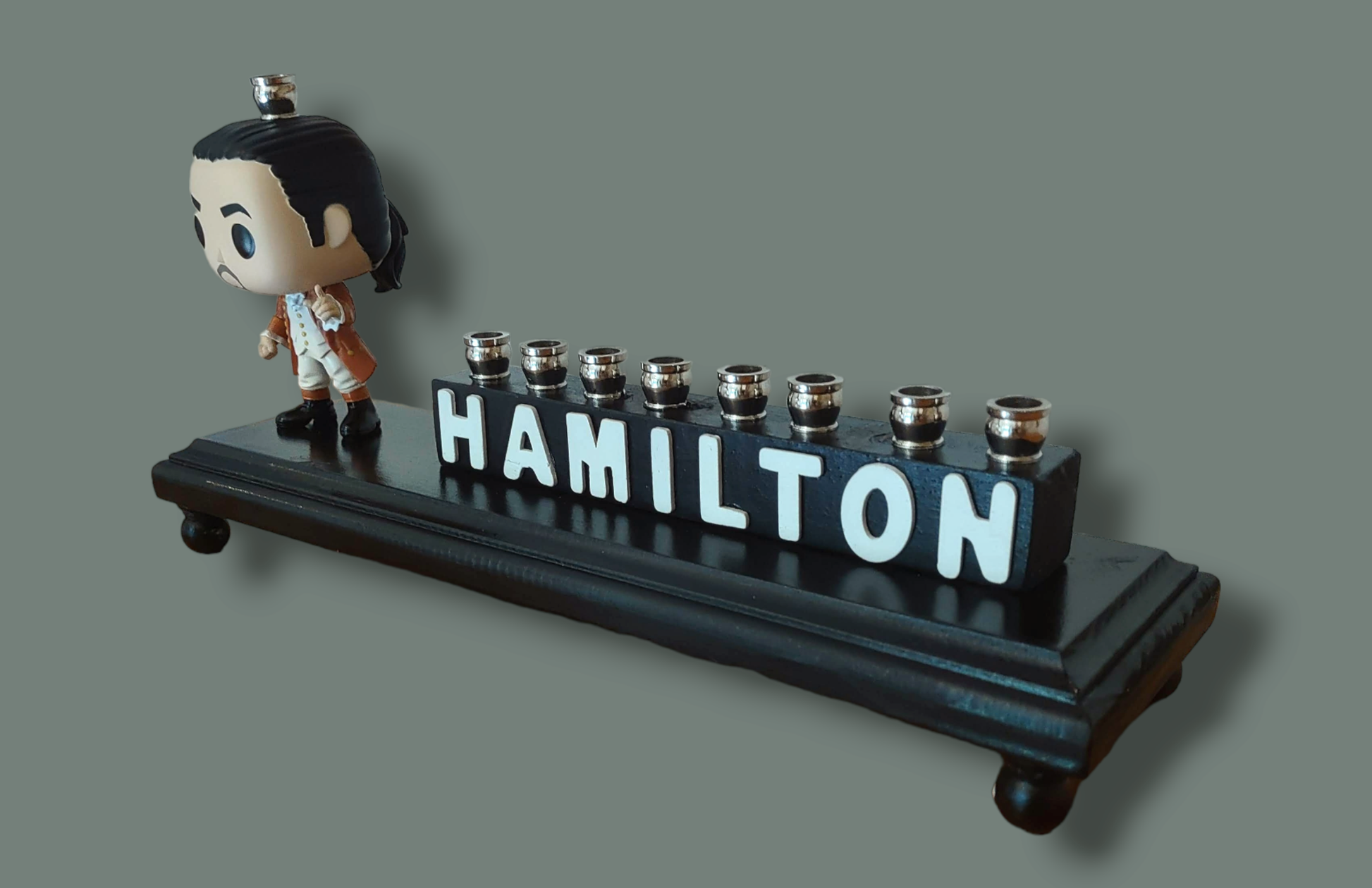 Hand-crafted from repurposed Hamilton collectible figure, nickel candle cups, wood letters, and wood plaque. Hamilton holds the shamash proud. Stands on a black platform with HAMILTON in white letters and nickel candle cups. Wow your Hanukkah guests with this special unique work of art. Holds standard sized Menorah candles.