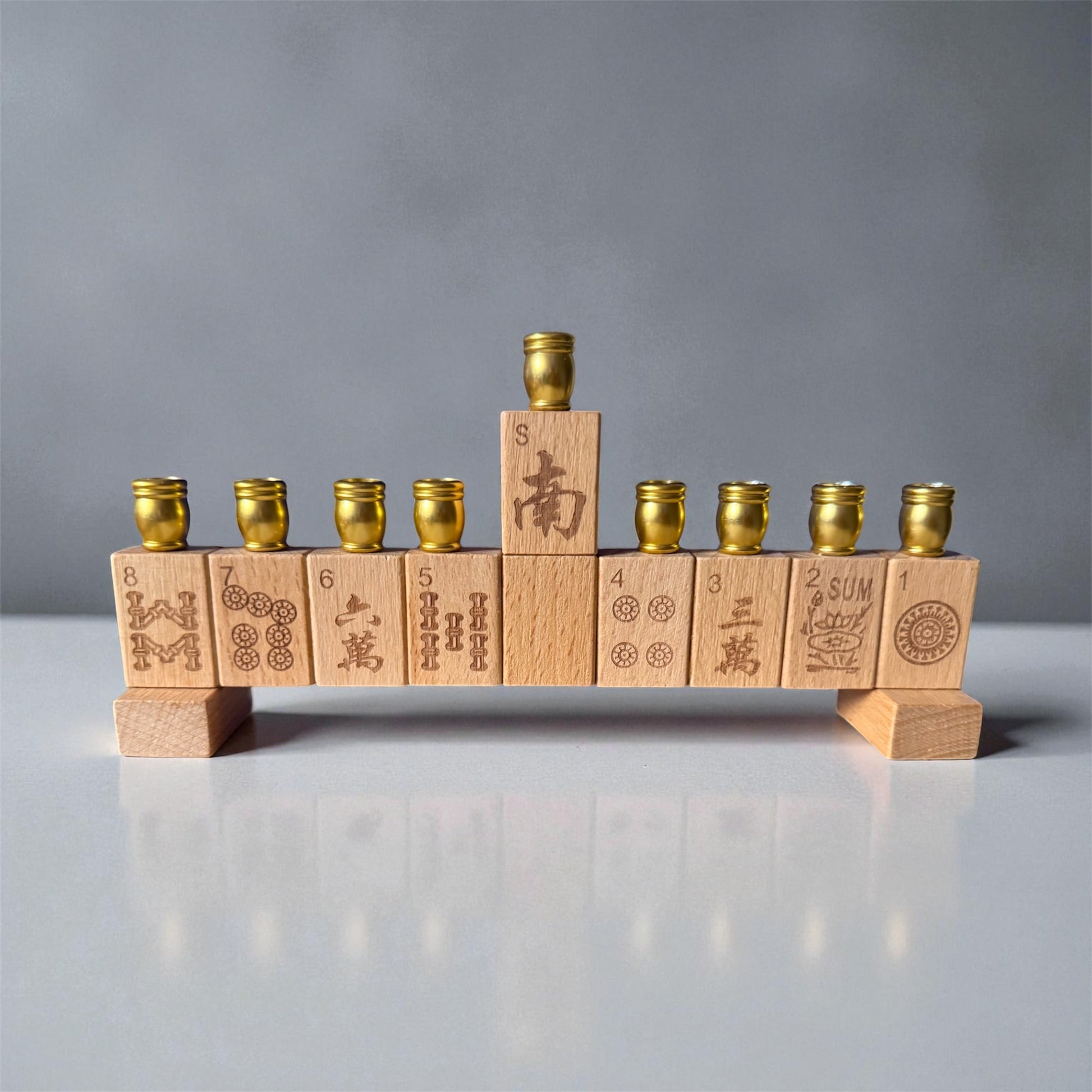 Hand-crafted from repurposed mah jong tiles and aluminum candle cups.