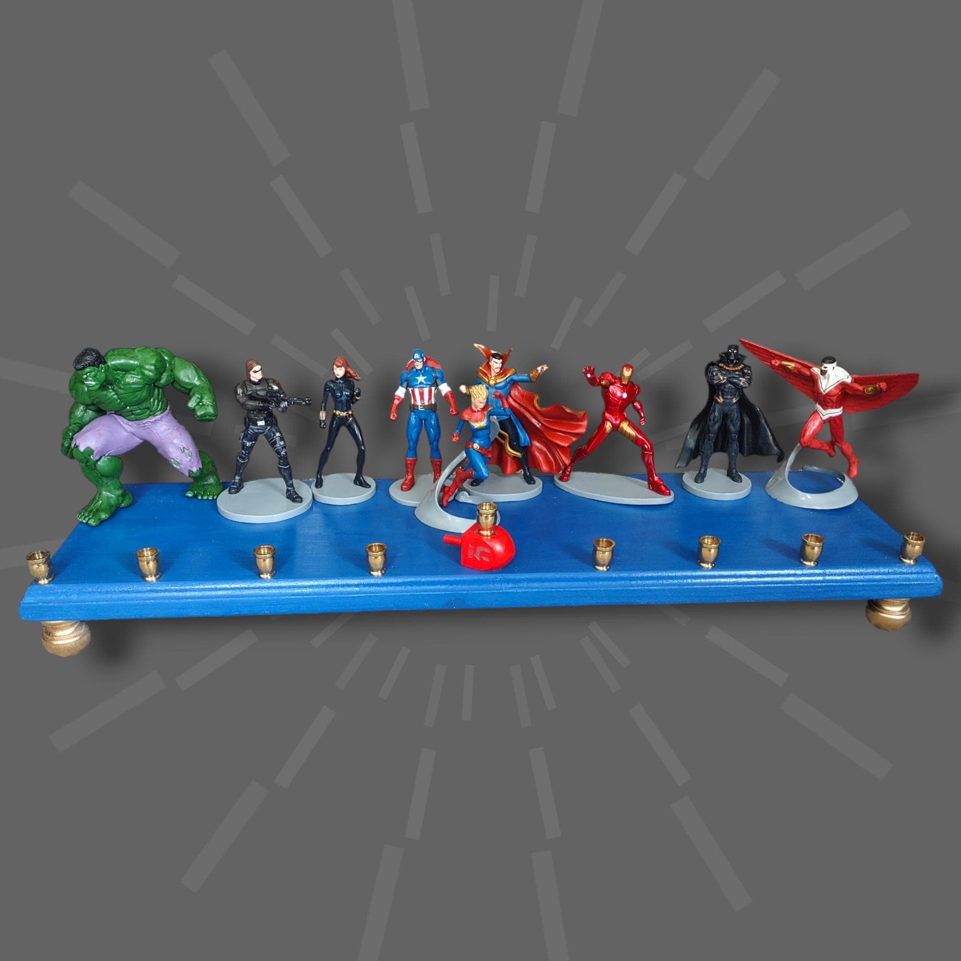 Hand-crafted Collectors Edition Avengers Menorah from repurposed action figures, wood plaque, brass candle cups, acrylic paint, and wood feet.