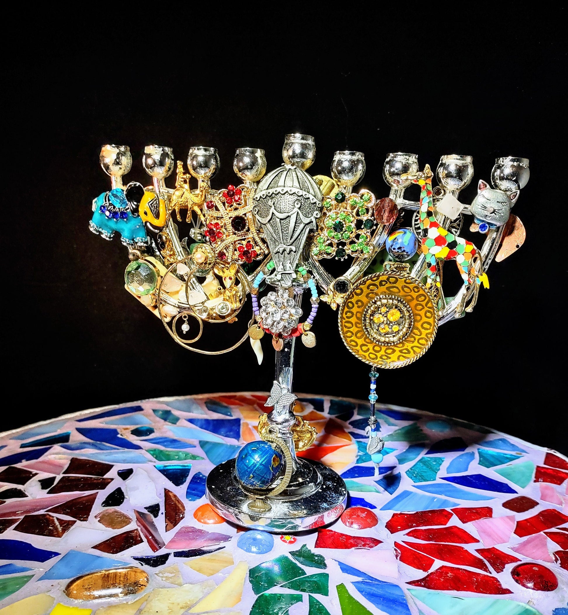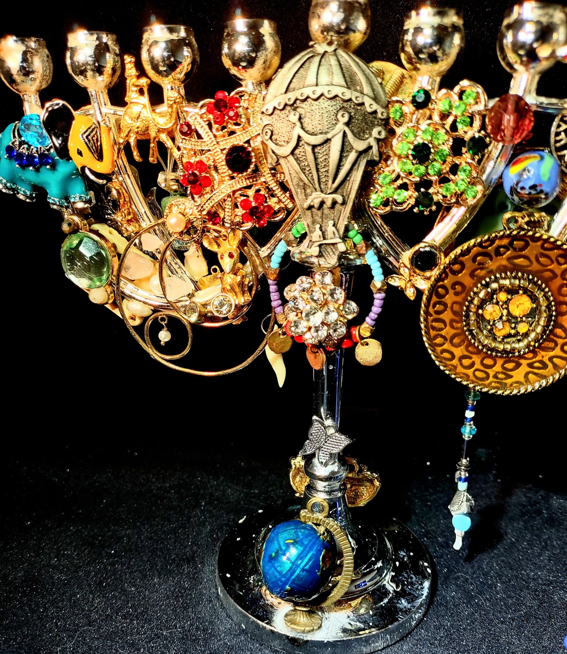 Hand-crafted from repurposed keychains, bracelets, earrings, brooches, and necklaces in silver, gold, brass, mixed metals, nickel, with Swarovski crystals, pearls, stone, wood, enamel, rhinestones, silver, gold, and glass beads. Wow your Chanukah guests with this sparkly unique work of art. Double sided. Holds standard sized Chanukah candles.