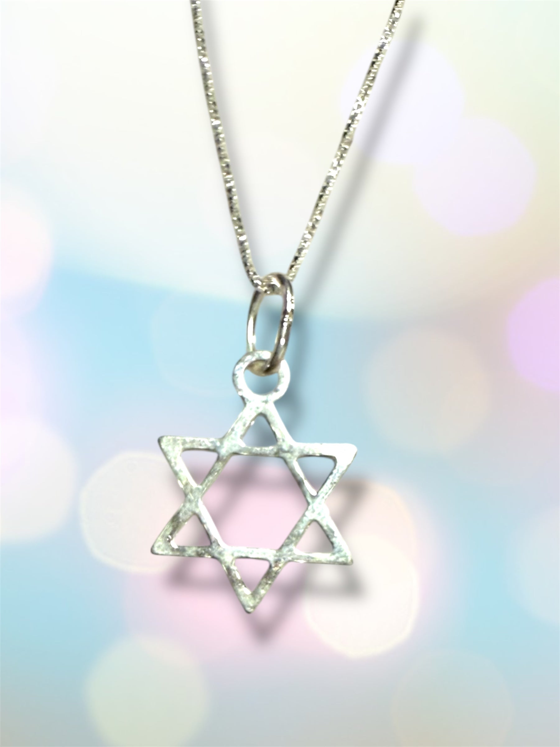 Classic and modern Jewish Star of David pendant necklace in sterling silver on an 16" sterling box chain necklace. Pendant measures 1.5" wide and 1.75" long.