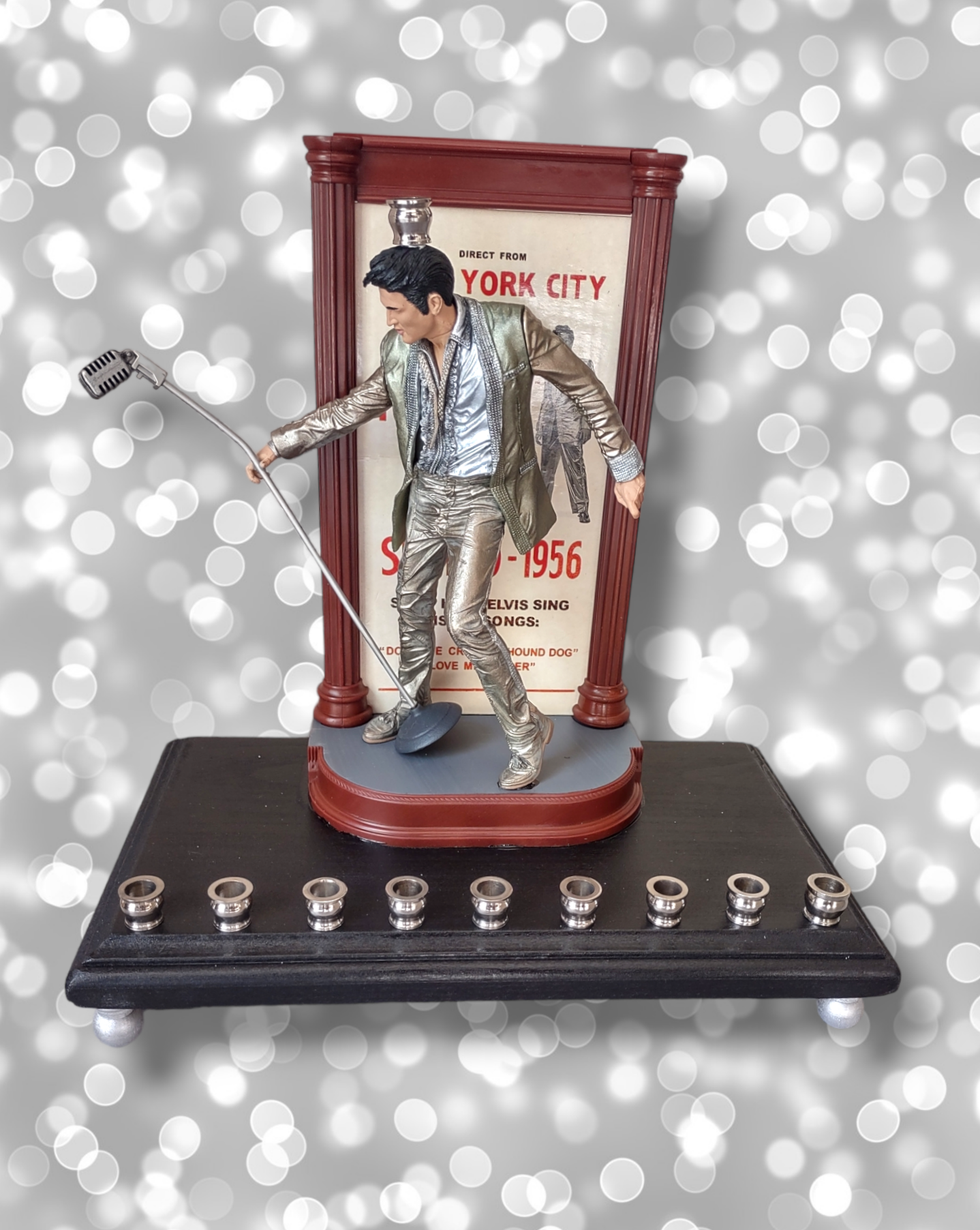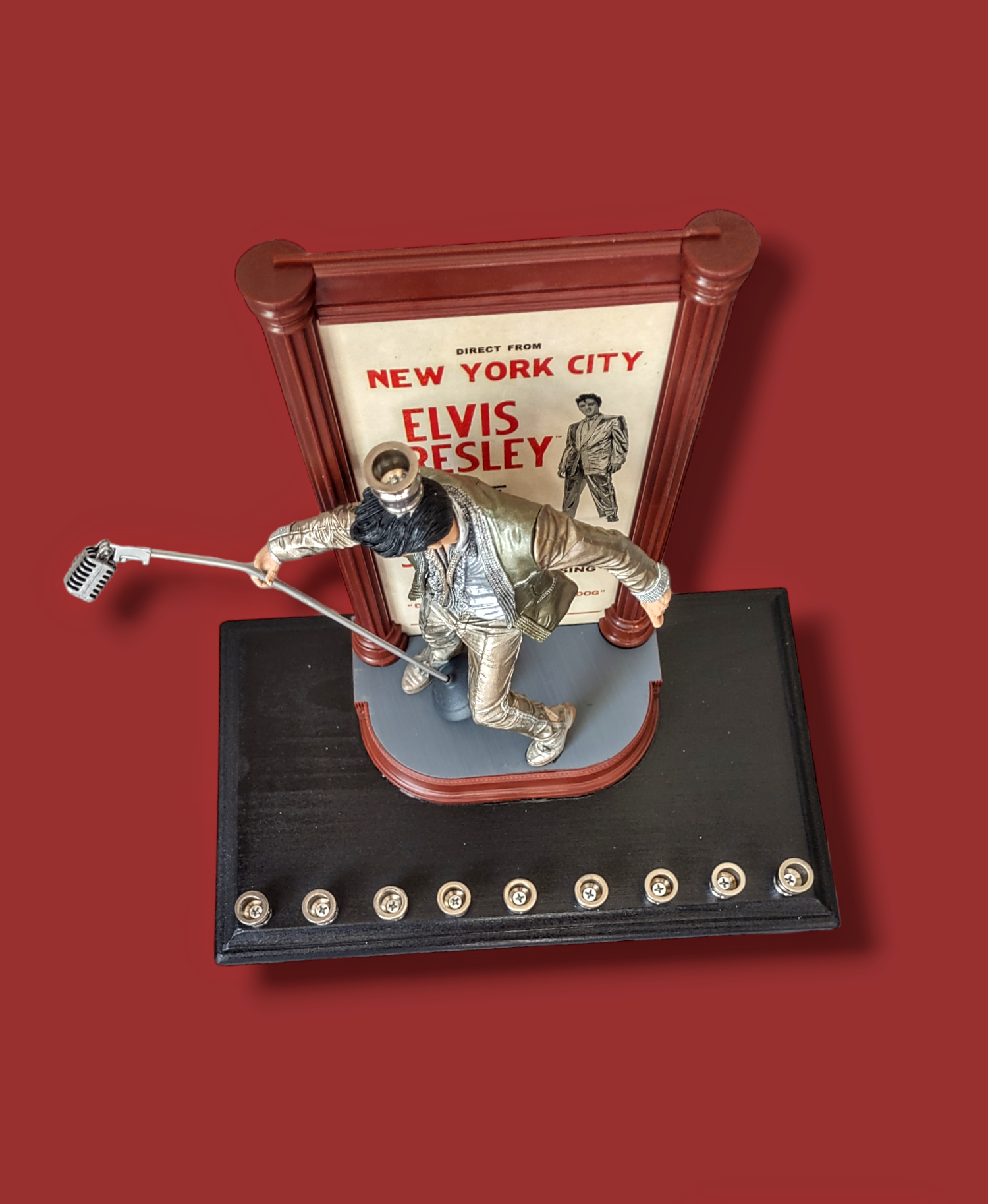 Hand-crafted from repurposed Elvis Presley Collectible figure. The variation is Elvis, with a live in NYC poster behind him, in a shimmering silver and gold suit holding a microphone.