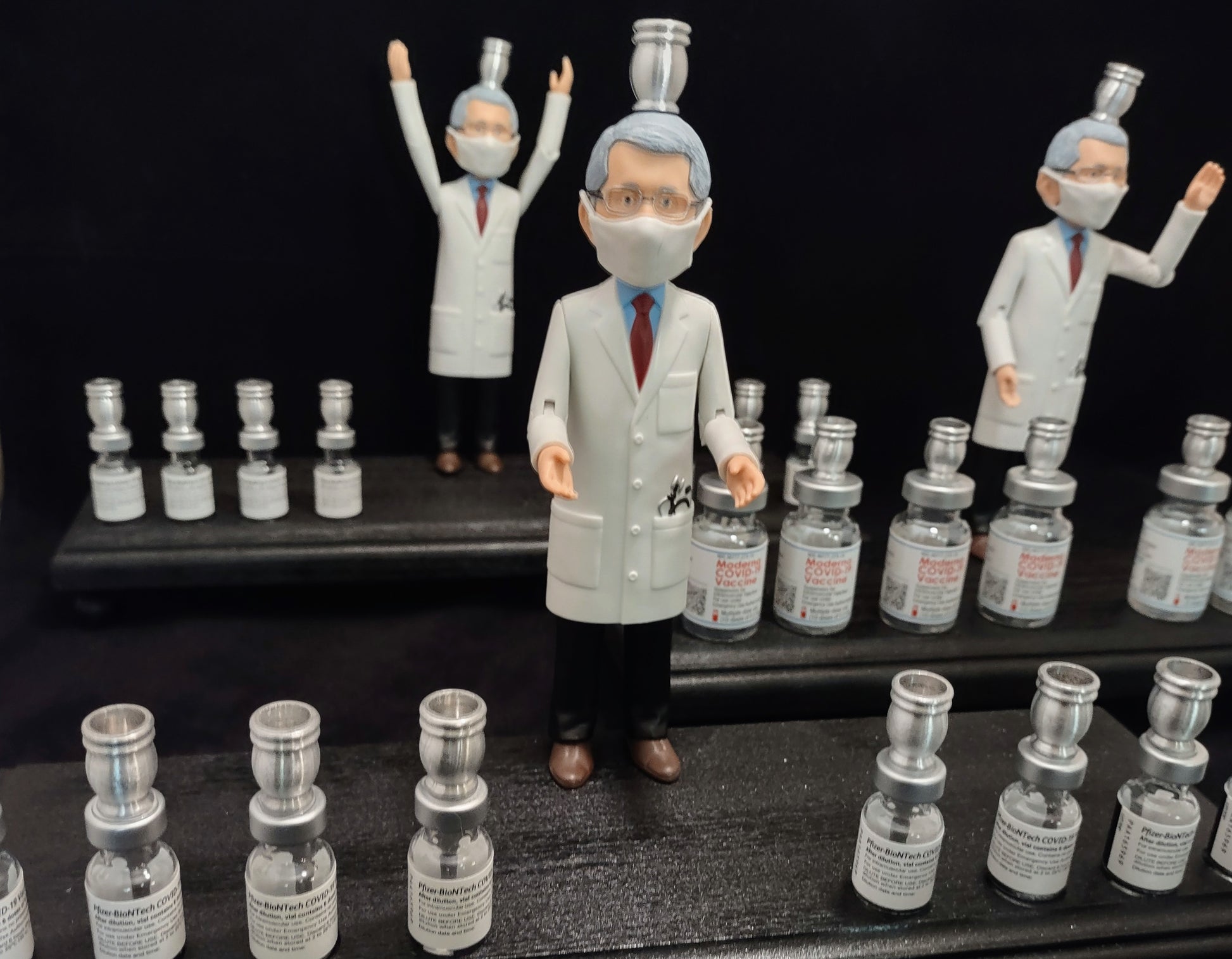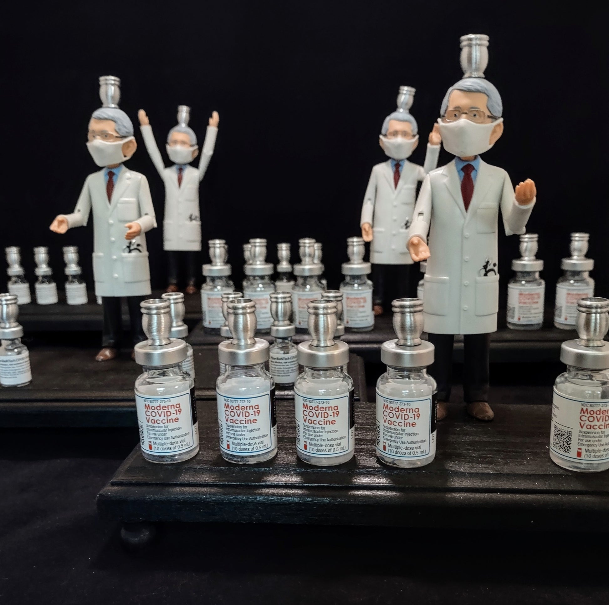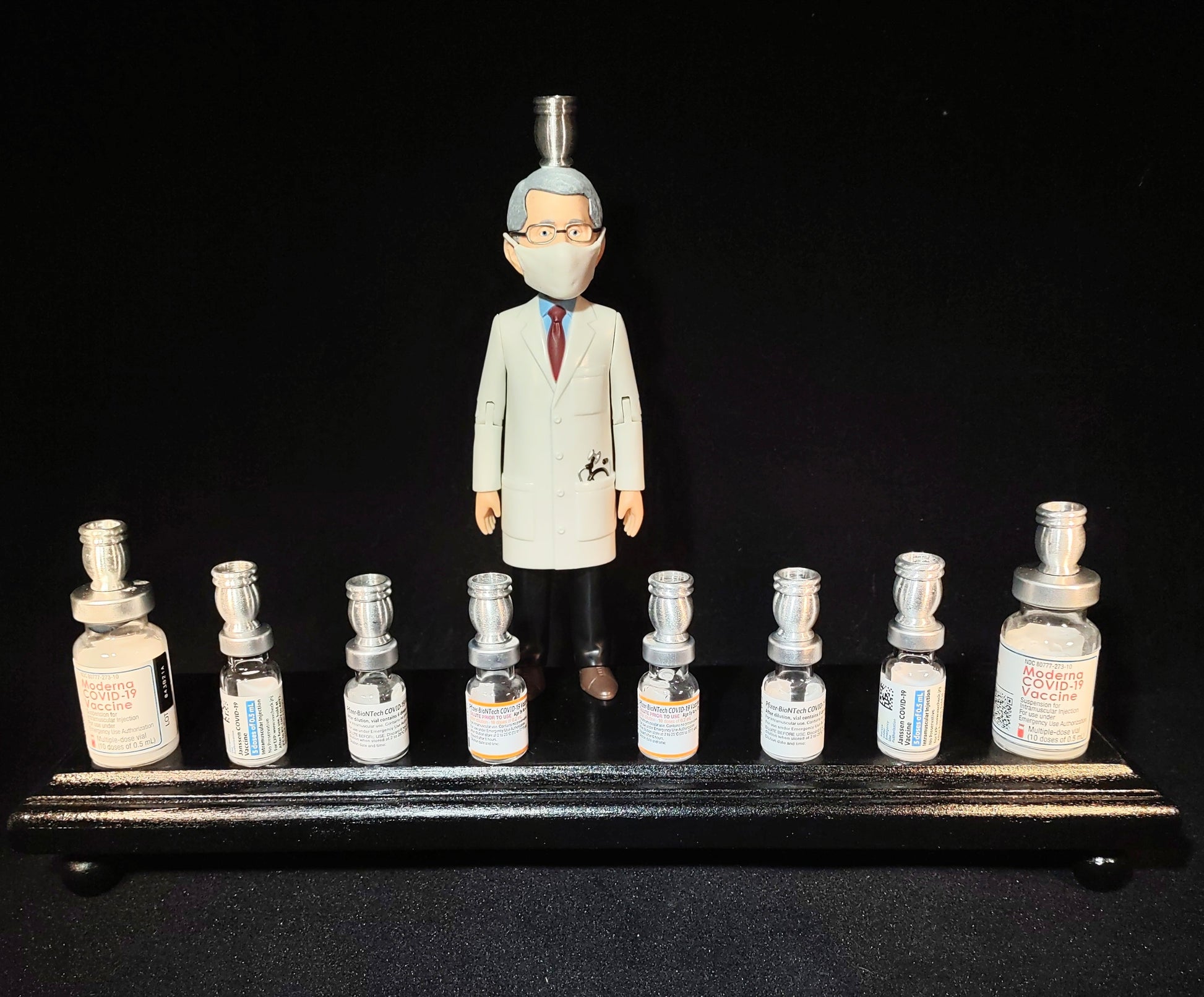 Limited Edition Dr. Fauci COVID19 Vaccine Menorah is hand-crafted with repurposed COVID19 glass vials, Dr. Fauci action figure (with removable mask!), wood base with wood feet, acrylic paint, and aluminum candle cups.