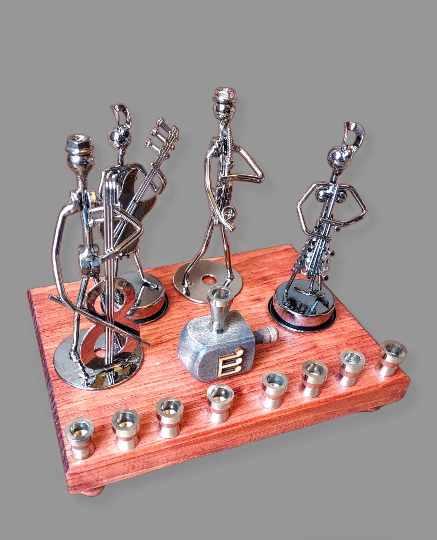 Hand-crafted from repurposed iron hardware twisted and shaped into these quirky musical band shapes. Made with stained wood base and feet, wooden dreidel wood cut out, and candle cups.
