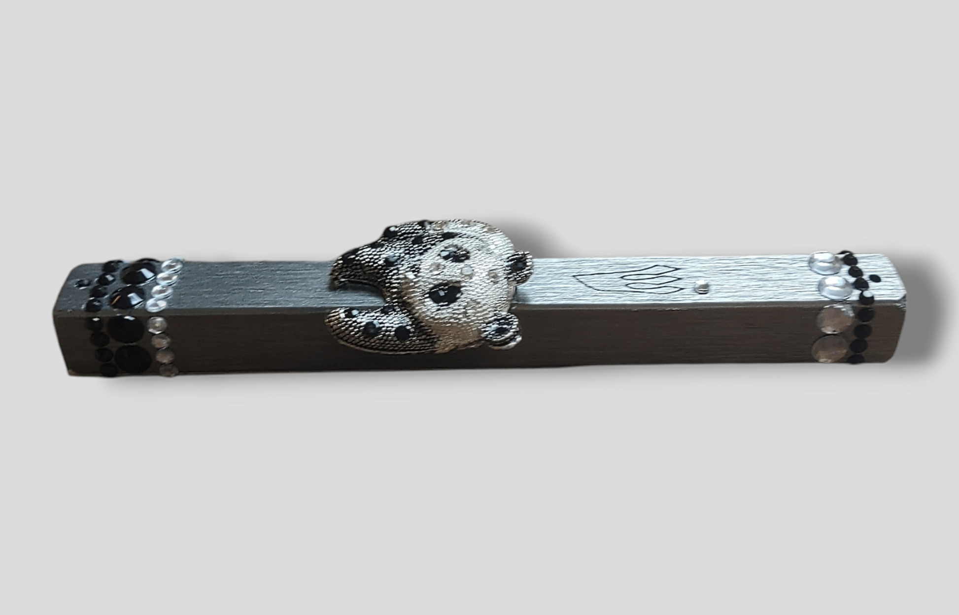 Silver Mezuzah case embellished with repurposed enamel jeweled hedgehog.